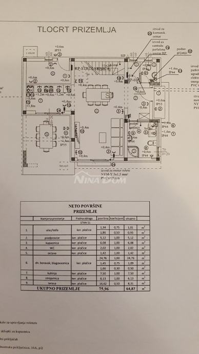 Prizemlje: ulaz-lođa, predprostor, kupaona, ec, ostava, dnevni boravak s blagovaonicom, kuhinja, strojarnica i lijepa terasa koja je povezana s vanjskim dvorišnim dijelom. korisne površine 75,96 m2 (64,87 m2)