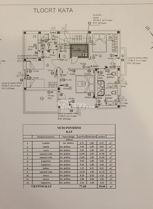 Unutarnje stepenice za kat: na katu se nalazi hodnik, 3 spavaće sobe i tri kupaonice, balkon, i dvije terase, sauna. korisne površine 77,40 m2 ( 70,44 m2)