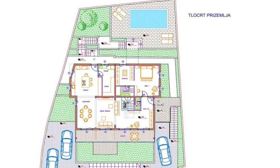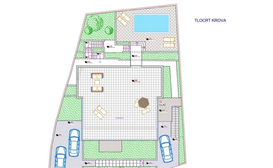 Kuća ima jako dobro i funkcionalno osmišljen prostor, raspoređen na prizemlju, prvom katu i prohodnom krovu koji je povezan s bazenom i sunčalištem, ukupne stambene površine 250 m2.