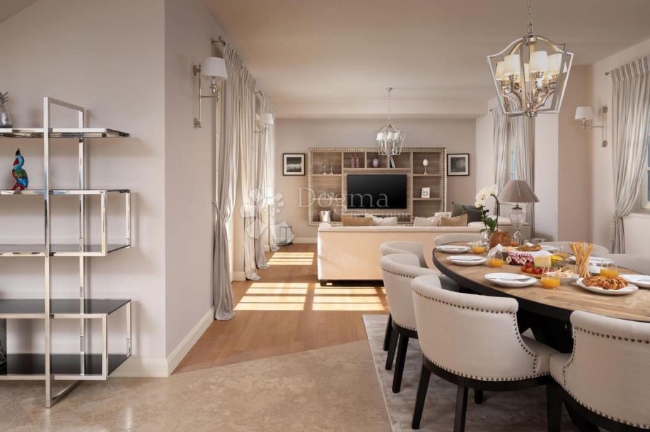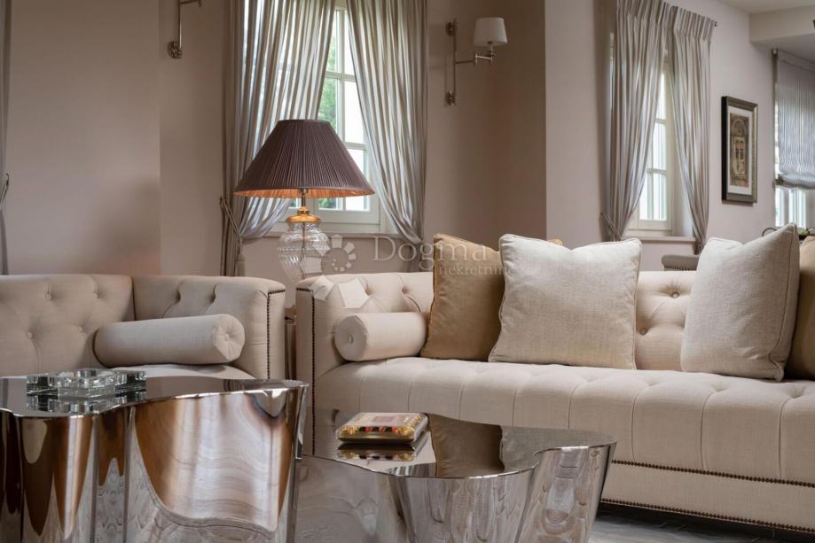 Prostran unutarnji prostor ispunjen je prirodnim svjetlom zahvaljujući velikim staklenim stijenama koje brišu granicu između interijera i eksterijera. Otvoreni dnevni prostor povezuje dnevni boravak, blagovaonicu i moderno opremljenu kuhinju u elegantnu i funkcionalnu cjelinu.
