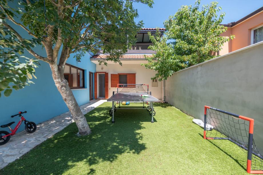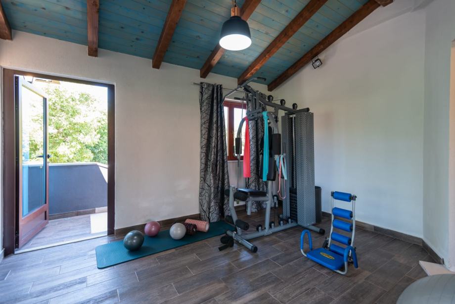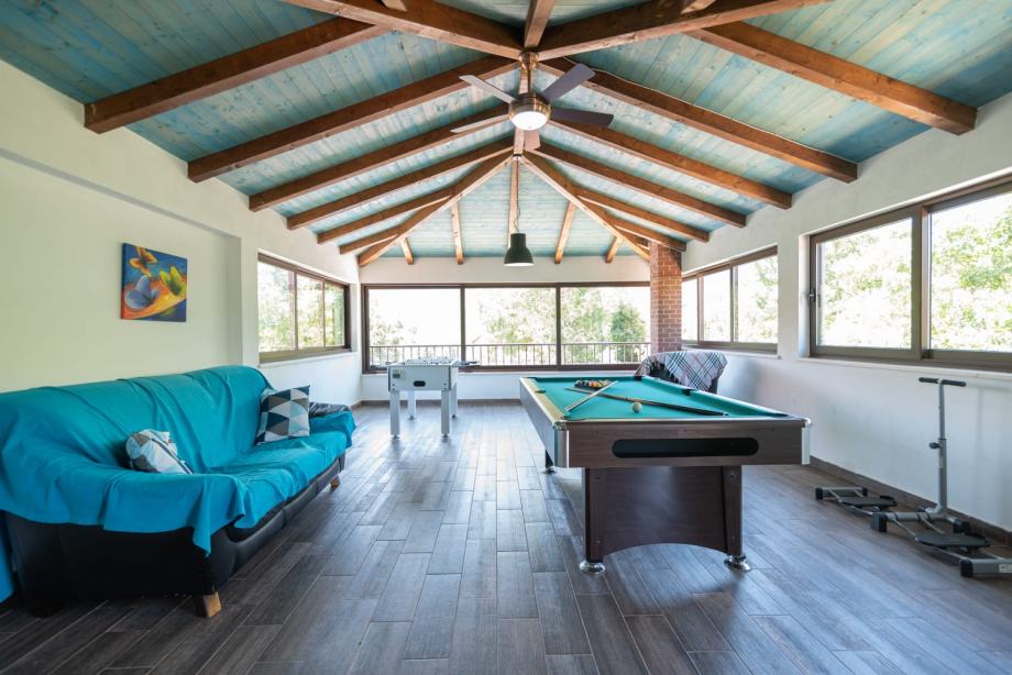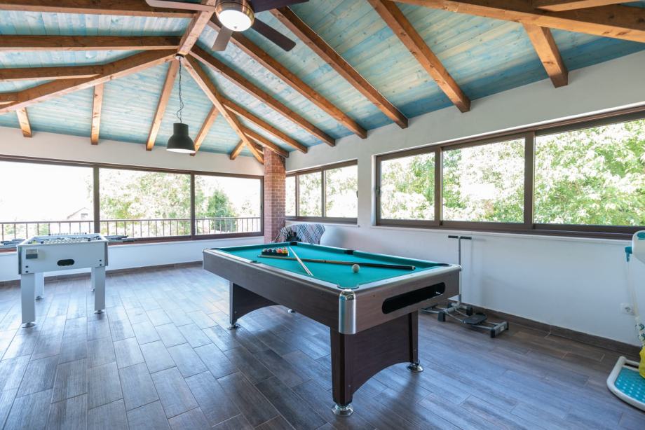 On the upper floor there are two more rooms (one with a toilet), a gym, billiards, a space for recreation and relaxation (table football), and a covered terrace. There are two garages in front, from which you can directly enter the house.