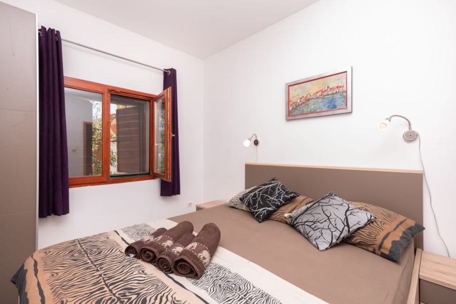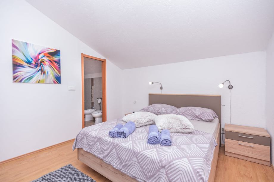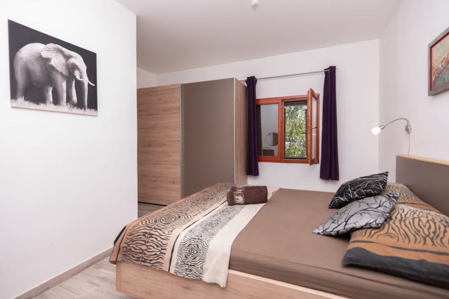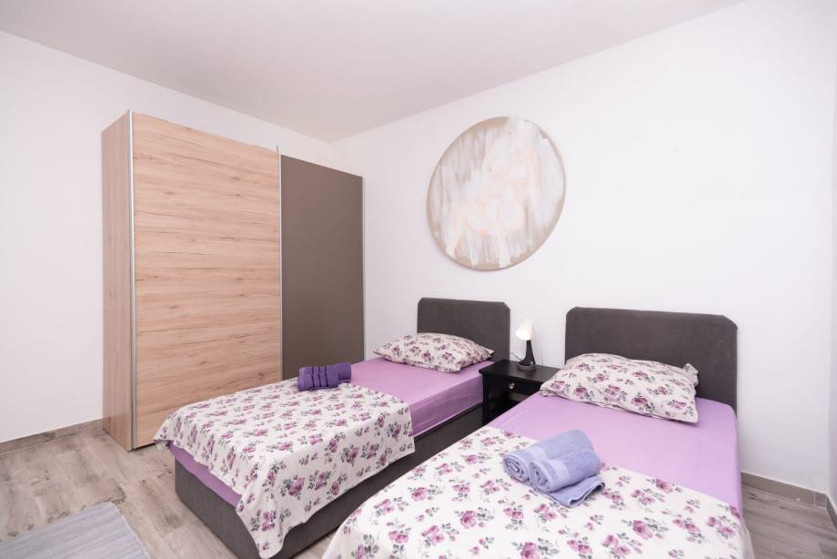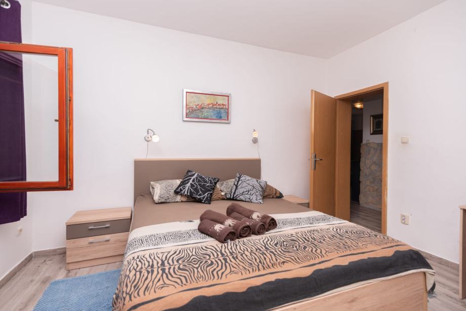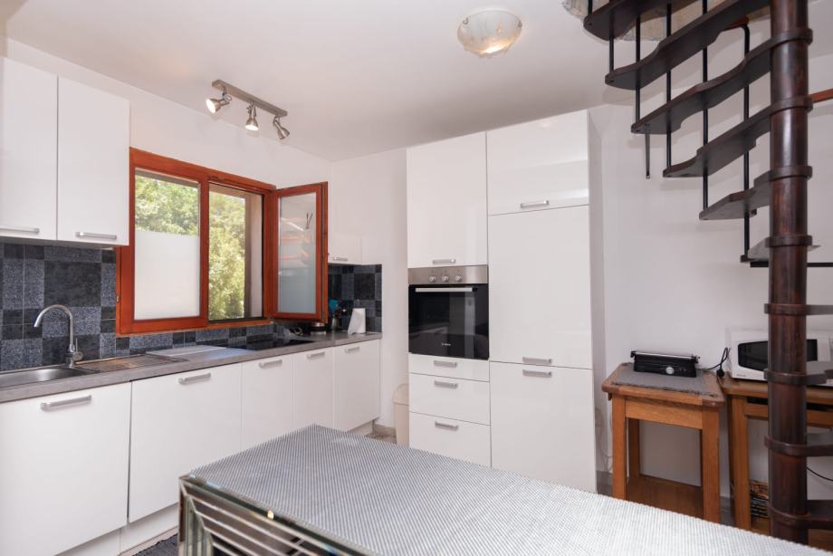 Na donjoj etaži su dnevni dio, dvije spavaće sobe, a jedna od njih ima svoj wc sa tuš kabinom, još jedan veći wc, kuhinja, te ljetna kuhinja sa nadstrešnicom i kaminom, te smočnica. Ispred se nalazi i bazen za relaksaciju i hlađenje u toplim ljetnim danima.