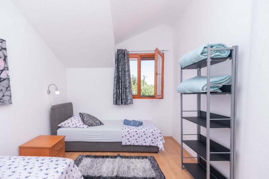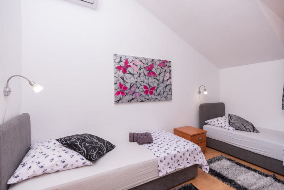 Na gornjoj etaži su još dvije sobe(jedna sa wc-om u njoj), teretana, biljar, prostor za rekreaciju i opuštanje (stolni nogomet), te natkrivena terasa. Ispred se nalaze dvije garaže iz kojih se direktno ulazi u kuću.