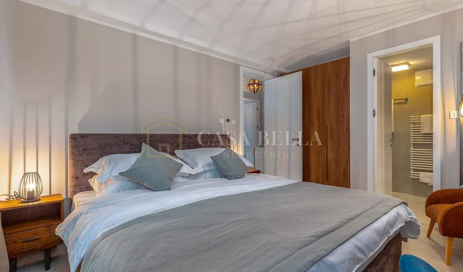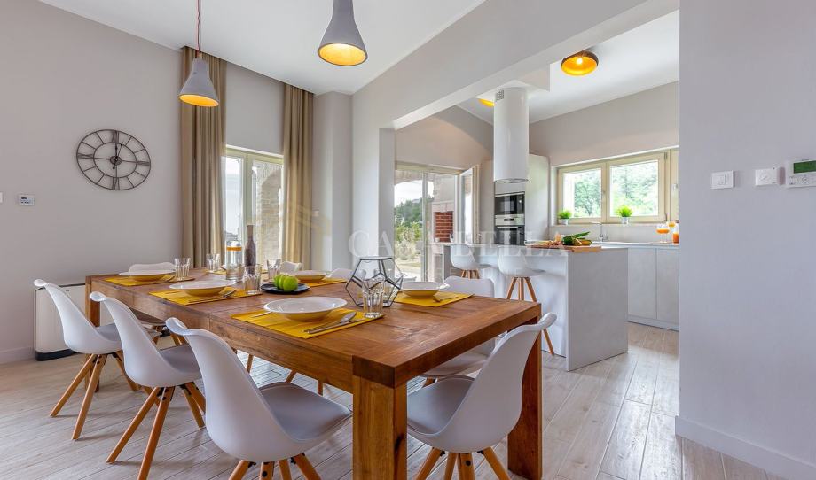 Ova moderno uređena vila odiše luksuzom i stilom – prostrani dnevni boravak s unutarnjim kaminom stvara toplu atmosferu, dok vrhunski opremljena kuhinja i blagovaonica pružaju idealan prostor za druženja i obiteljske večere.