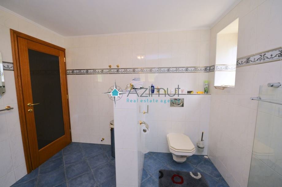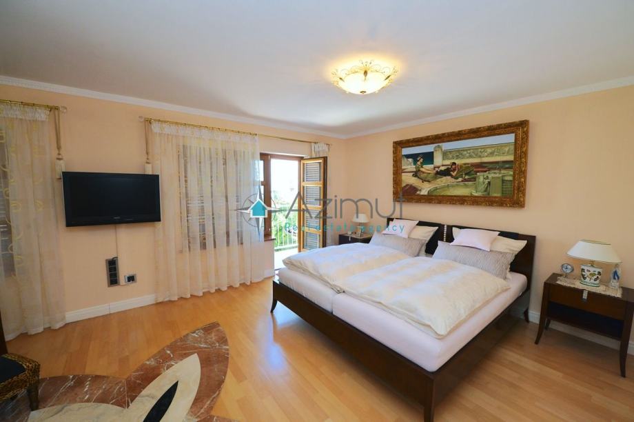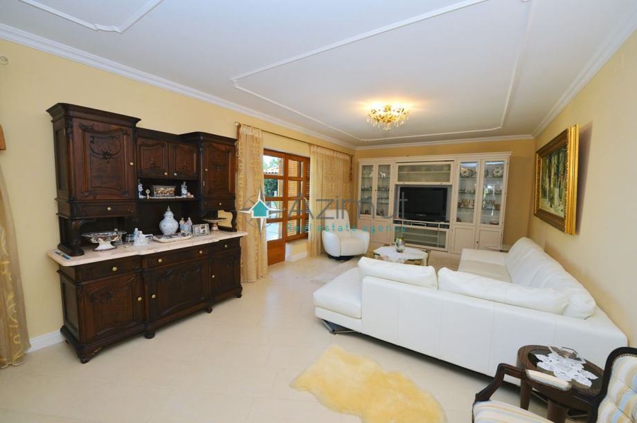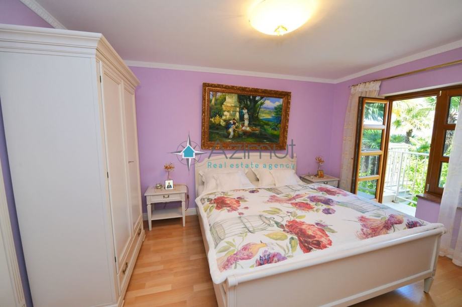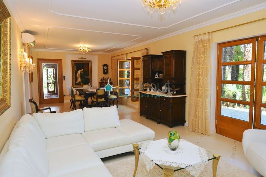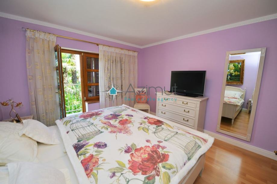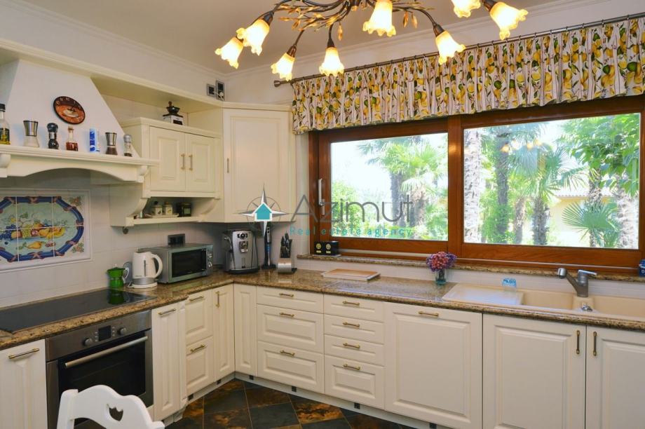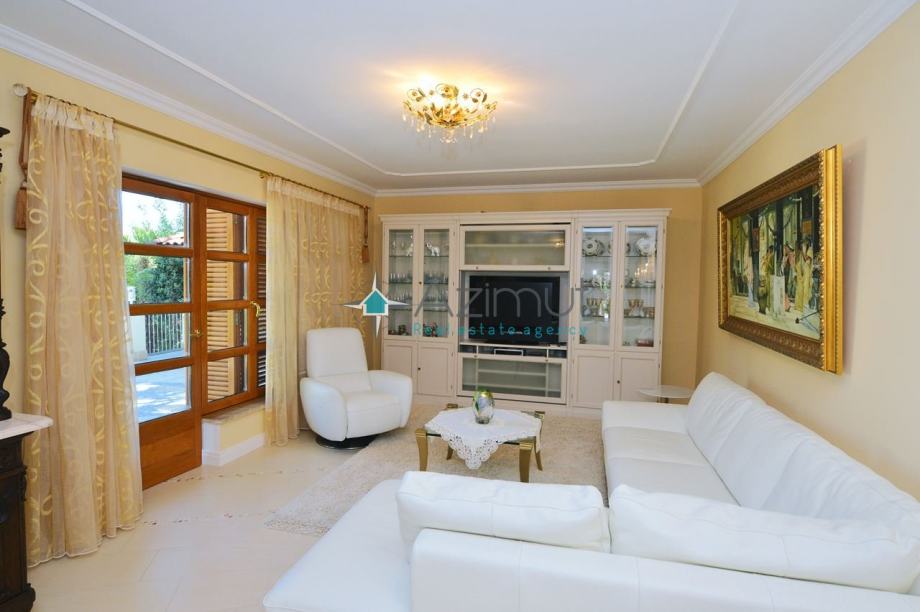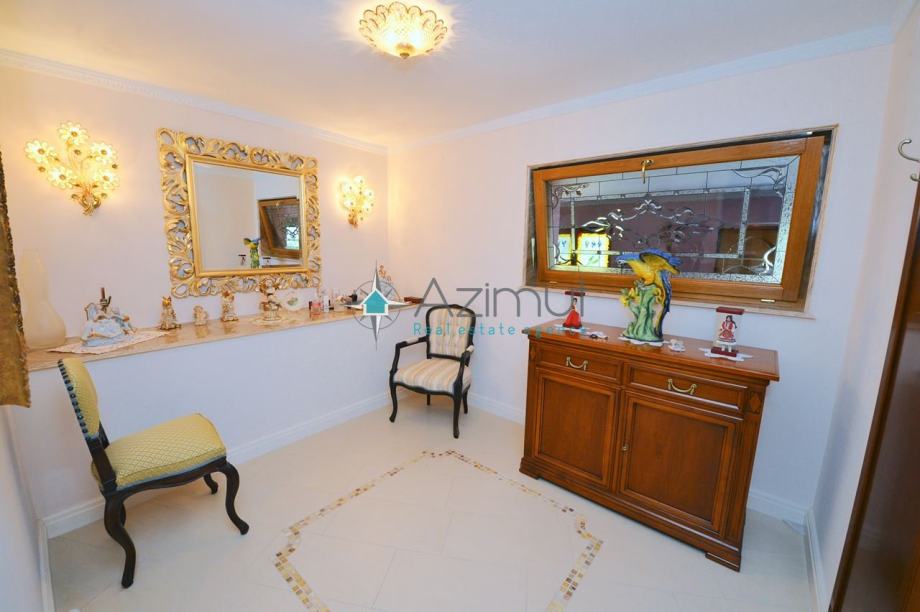 Zaklonjena od pogleda, odlično pozicionirana na okućnici, okružena prekrasnim mediteranskim biljem I palmama, ova je vila stvorena za uživanje te pruža potpunu intimu budućem vlasniku. Potpuno ograđena okućnica unutar koje se nalazi garaža kao poseban objekt, bazen te manji objekt koji služi kao vešeraj. Kuća je koncipirana kao dvoetažan stan vrlo komotnih prostorija, luksuzno uređenih. U prizemlju vile je veliki dnevni boravak sa blagavaonicom, velika kuhinja, predsoblje i kupaonica, dok su na katu dvije spavaće sobe od kojih je jedna master bedroom sa kupaonicom, te jedna radna soba i kupaonica. Kuća je kompletno namještena i kao takva se i prodaje, osim osobnih stvari.
