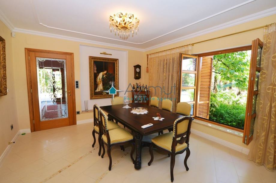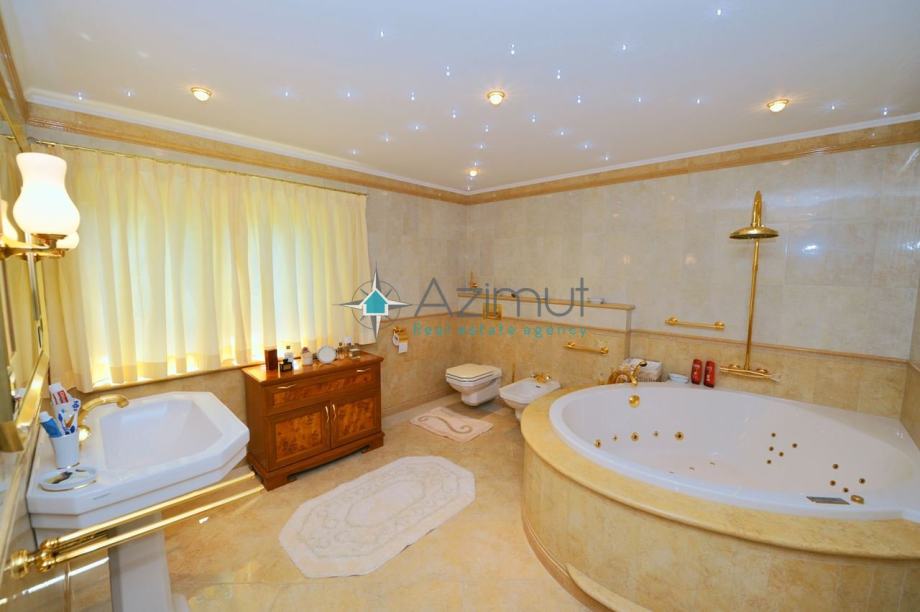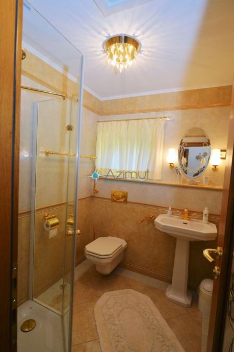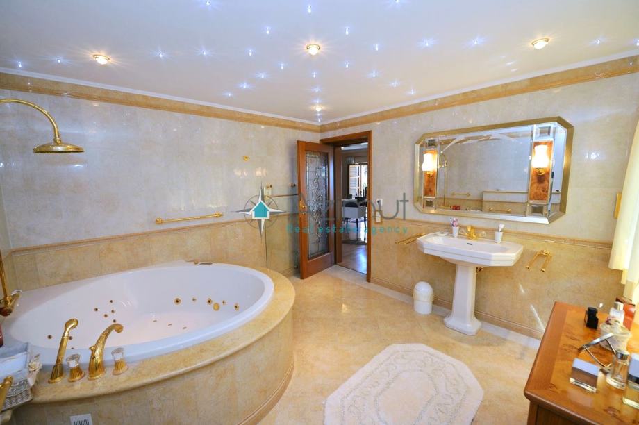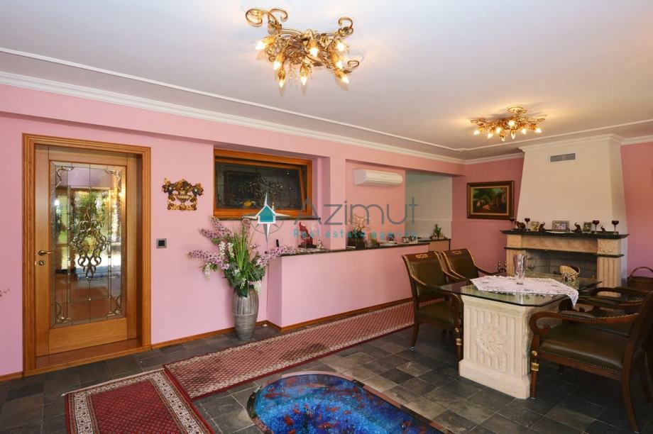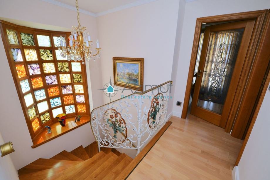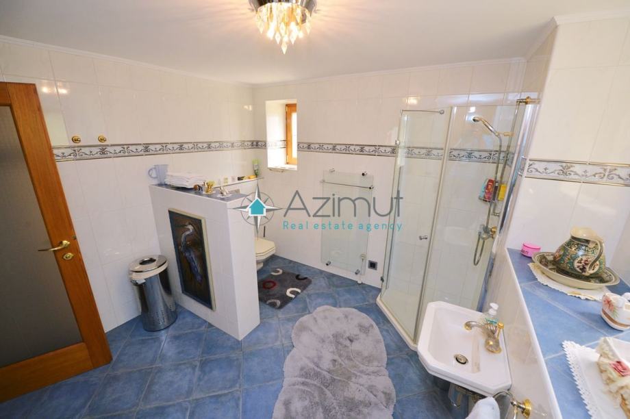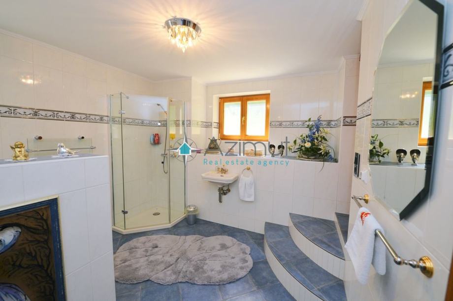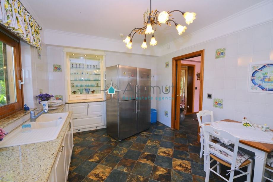 Zaklonjena od pogleda, odlično pozicionirana na okućnici, okružena prekrasnim mediteranskim biljem I palmama, ova je vila stvorena za uživanje te pruža potpunu intimu budućem vlasniku. Potpuno ograđena okućnica unutar koje se nalazi garaža kao poseban objekt, bazen te manji objekt koji služi kao vešeraj. Kuća je koncipirana kao dvoetažan stan vrlo komotnih prostorija, luksuzno uređenih. U prizemlju vile je veliki dnevni boravak sa blagavaonicom, velika kuhinja, predsoblje i kupaonica, dok su na katu dvije spavaće sobe od kojih je jedna master bedroom sa kupaonicom, te jedna radna soba i kupaonica. Kuća je kompletno namještena i kao takva se i prodaje, osim osobnih stvari.
