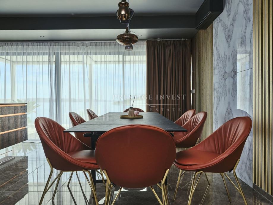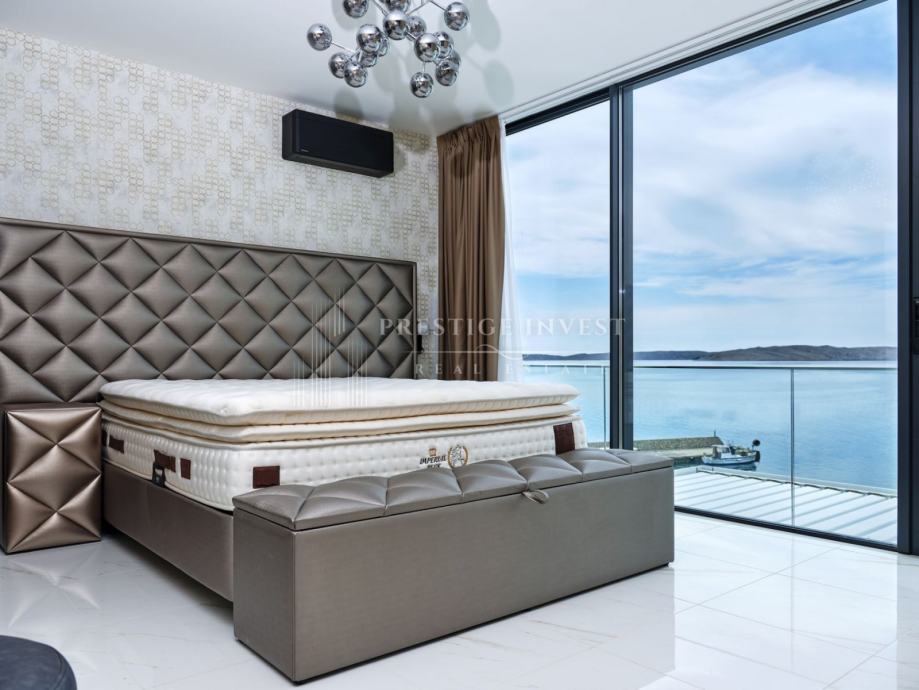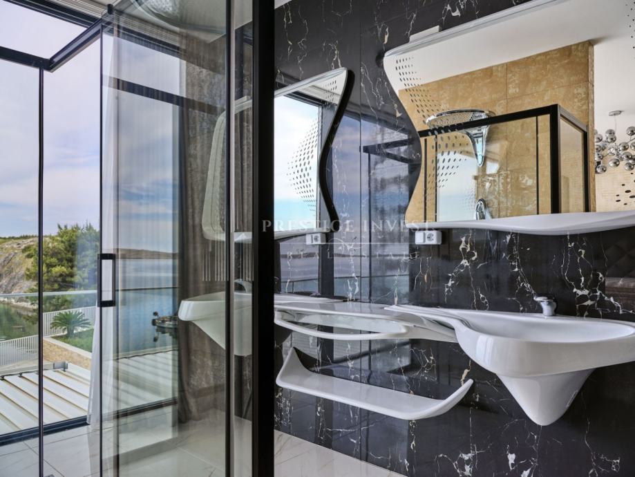 Ova izvanredna vila ima 4 prostrane spavaće sobe smještene na gornjem katu, svaka nudi neometan, panoramski pogled kroz staklene stijenke na očaravajući morski horizont, osiguravajući maksimalnu privatnost bez susjednih pogleda. Glavna spavaća soba uključuje vlastitu kupaonicu. Dodatno, na istom katu, nalaze se 3 elegantno uređene kupaonice s najsofisticiranijom opremom i sanitarijama talijanskog brenda Noken, potpisanom od strane Zaha Hadid.