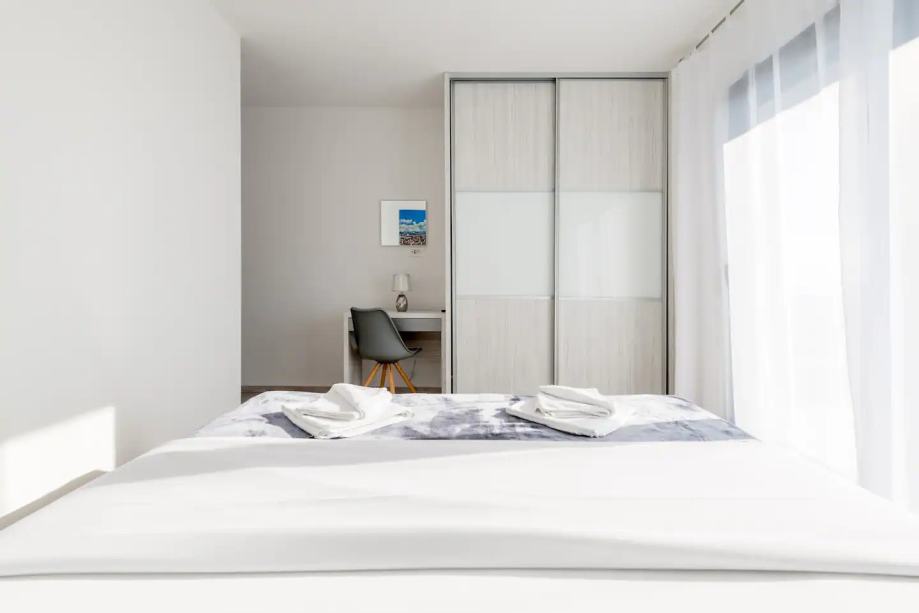 Stan se sastoji od dva ulazna hodnika, kuhinje - blagavaonice, dnevnog boravka, tri spavaće sobe, hodnika i kupaonice. Stan ima dva ulaza, jedan zajednički iz portuna i jedan privatni sa terase.
