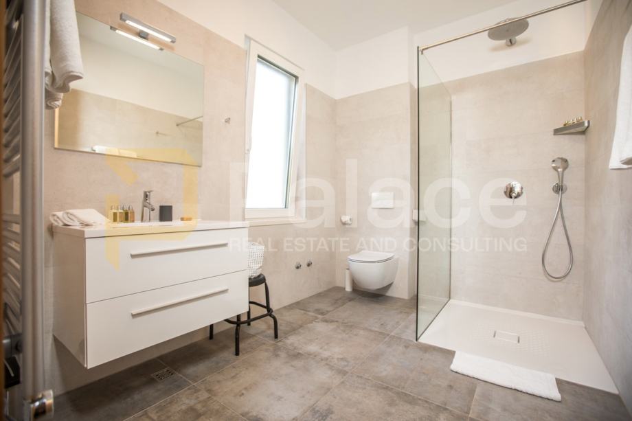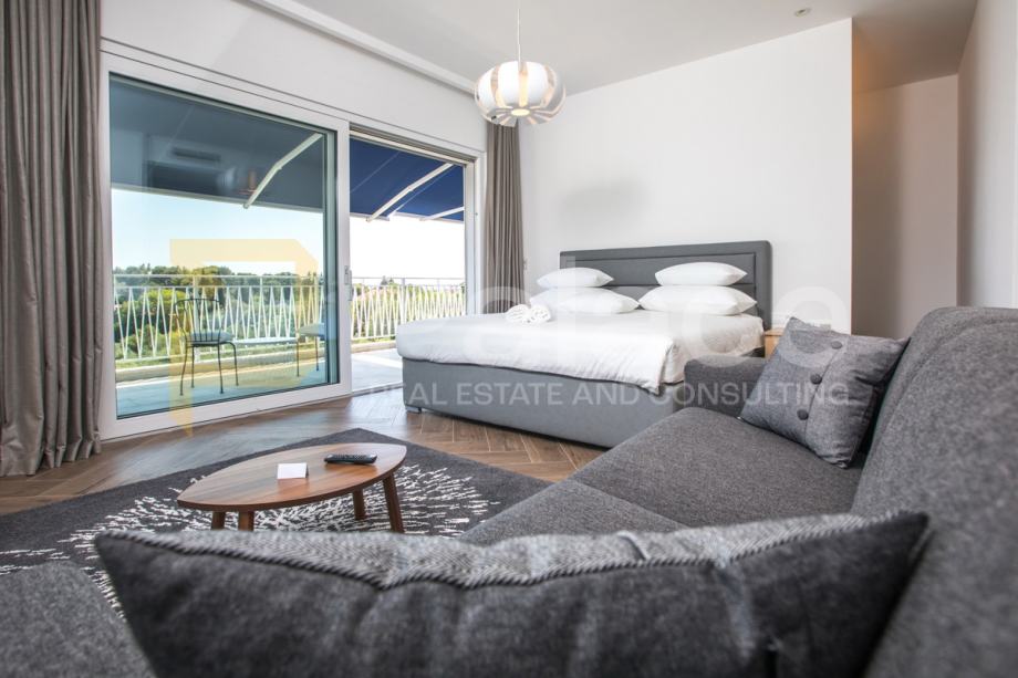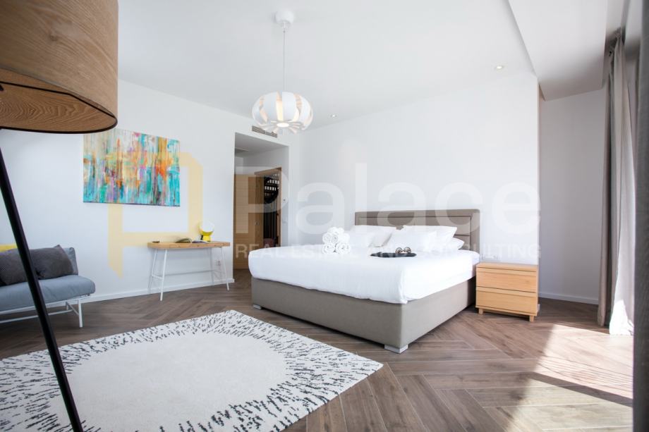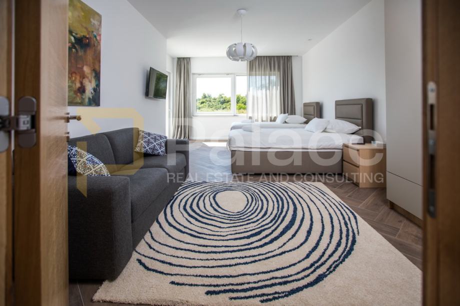 Na gornjoj etaži nalaze se četiri prostrane spavaće sobe, svaka s vlastitom kupaonicom, garderobom i izlazom na balkon. Donja etaža obuhvaća prostran dnevni boravak, moderno opremljenu kuhinju s blagovaonicom te dodatni prostor za rekreaciju.
