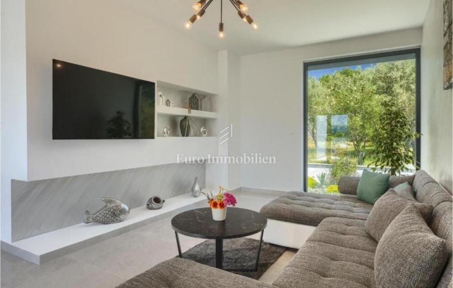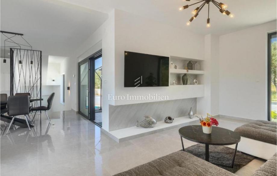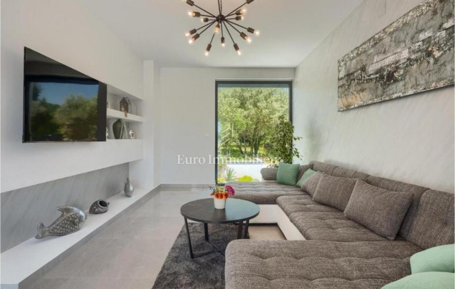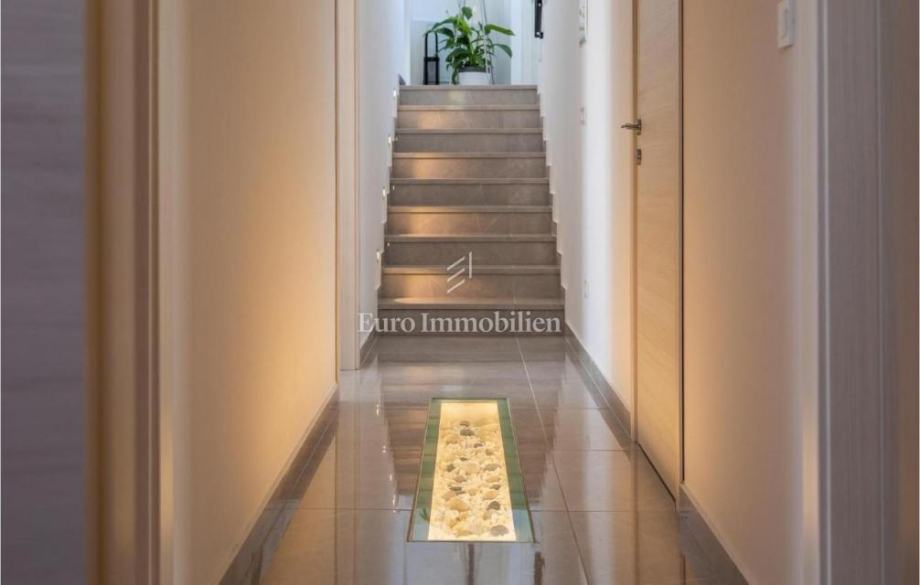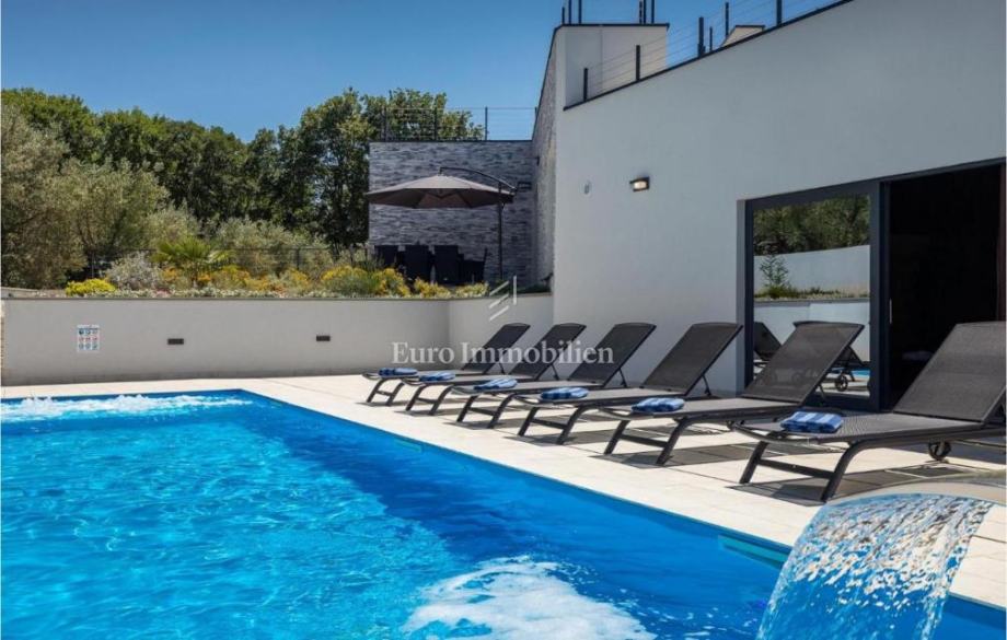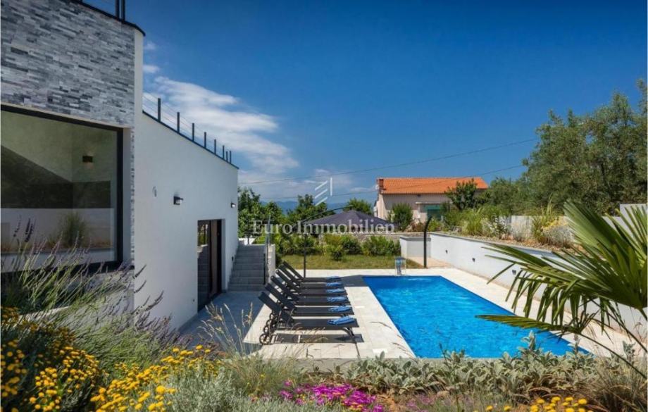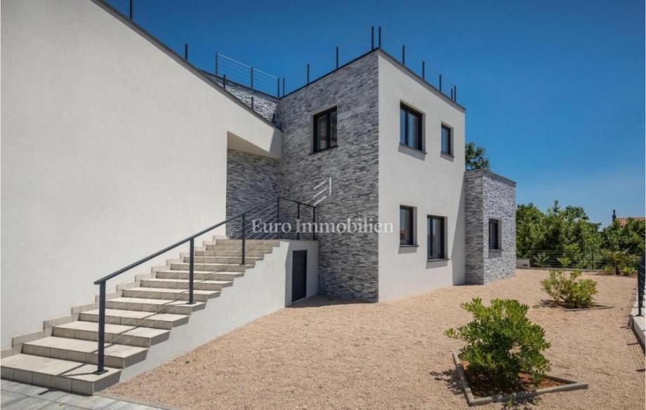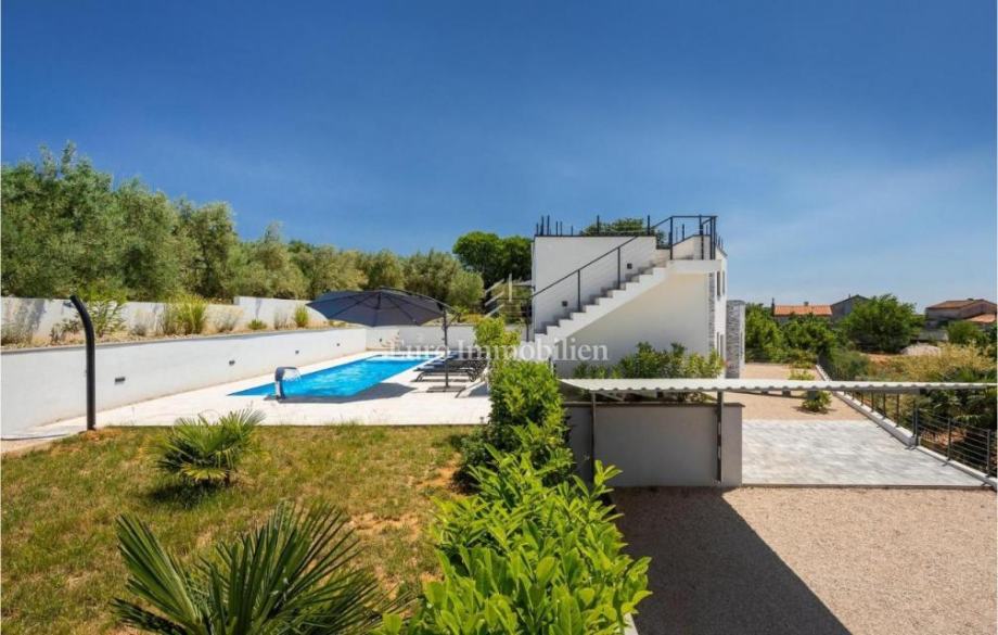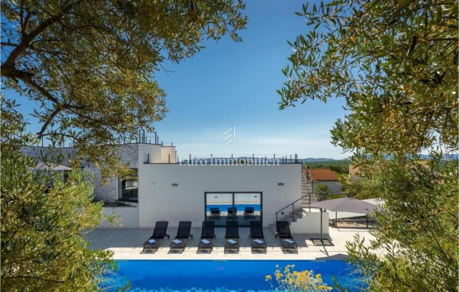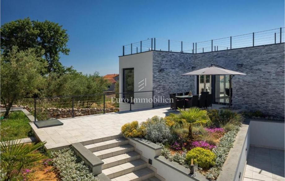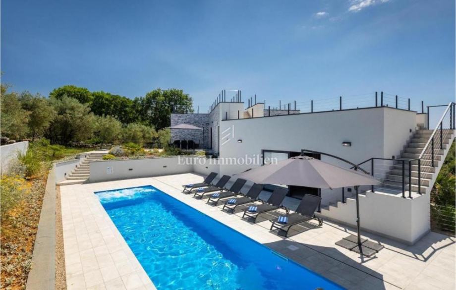 Villa je sagrađena na parceli od 1150 m2, površine je 165 m2 i sastoji se od prizemlja, međukata i kata. Prizemlje se sastoji od tri spavaće sobe, dvije kupaonice, spremišta i strojarnice bazena. Na međukatu je smješten wellness s kupaonom, s izlazom na bazen sa sunčalištem. Na katu se nalazi kuhinja s blagovaonom i dnevnim boravkom, wc i velike terase. S krovne terase se pruža odličan pogled na more i zelenilo. Na okućnici se nalazi parkirni prostor za četiri automobila od kojih su dva natkrivena, uređena je hortikultura, bazen ima površinu 42 m2 s dva ležaja s ugrađenom instalacijom za hidro masažu. Grijanje i hlađenje su preko dizalice topline i napravljena je priprema za solarne panele. Nekretnina se nalazi na mirnoj lokaciji uz rub zelene zone, i pruža priliku za vlastito korištenje ili turistički najam.