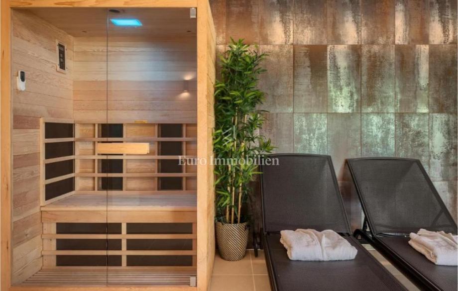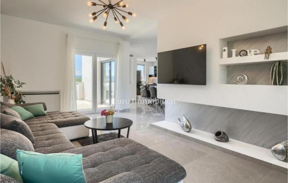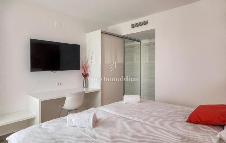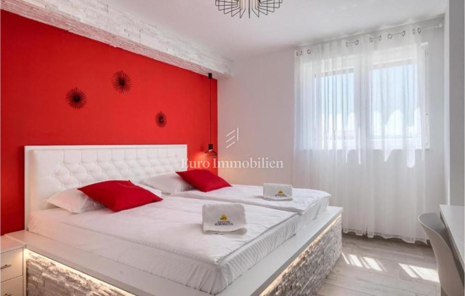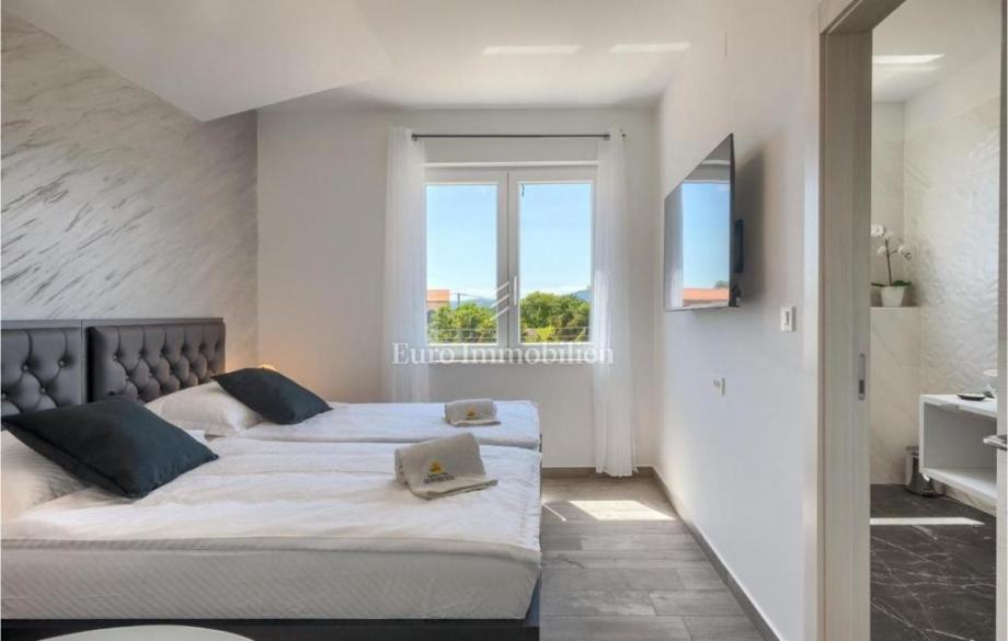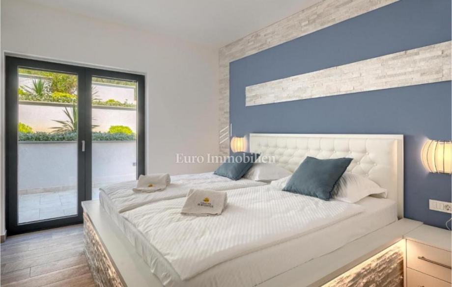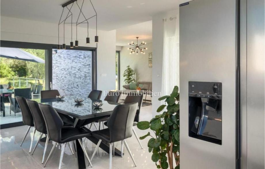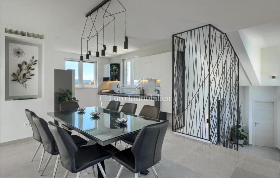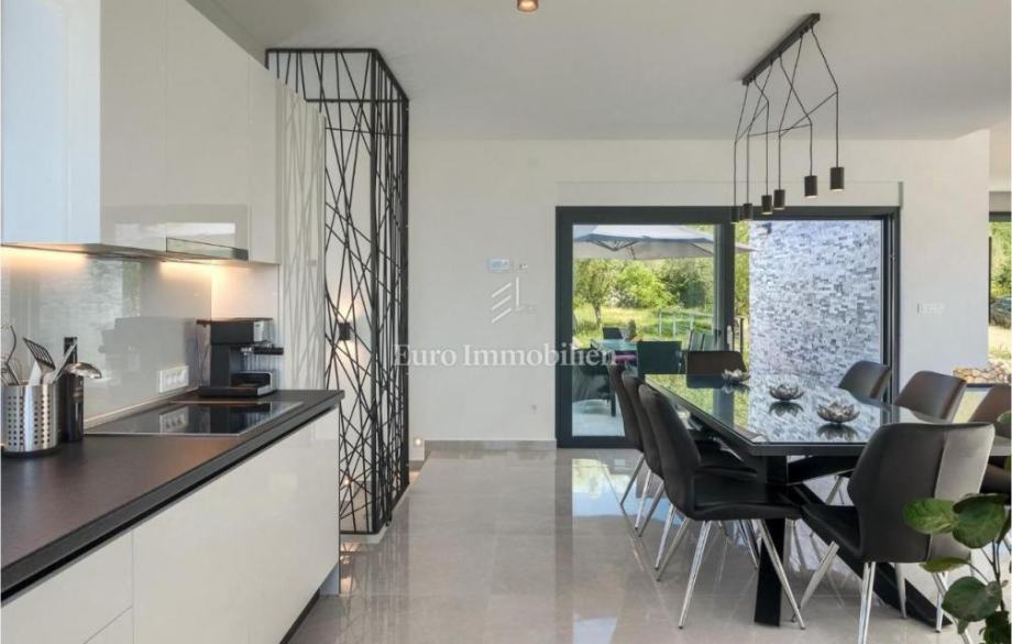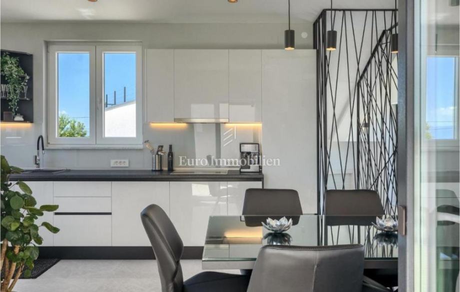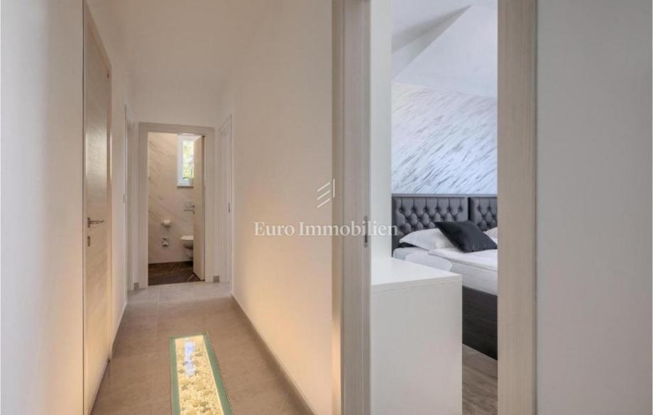 Villa je sagrađena na parceli od 1150 m2, površine je 165 m2 i sastoji se od prizemlja, međukata i kata. Prizemlje se sastoji od tri spavaće sobe, dvije kupaonice, spremišta i strojarnice bazena. Na međukatu je smješten wellness s kupaonom, s izlazom na bazen sa sunčalištem. Na katu se nalazi kuhinja s blagovaonom i dnevnim boravkom, wc i velike terase. S krovne terase se pruža odličan pogled na more i zelenilo. Na okućnici se nalazi parkirni prostor za četiri automobila od kojih su dva natkrivena, uređena je hortikultura, bazen ima površinu 42 m2 s dva ležaja s ugrađenom instalacijom za hidro masažu. Grijanje i hlađenje su preko dizalice topline i napravljena je priprema za solarne panele. Nekretnina se nalazi na mirnoj lokaciji uz rub zelene zone, i pruža priliku za vlastito korištenje ili turistički najam.