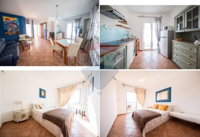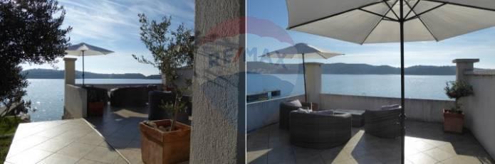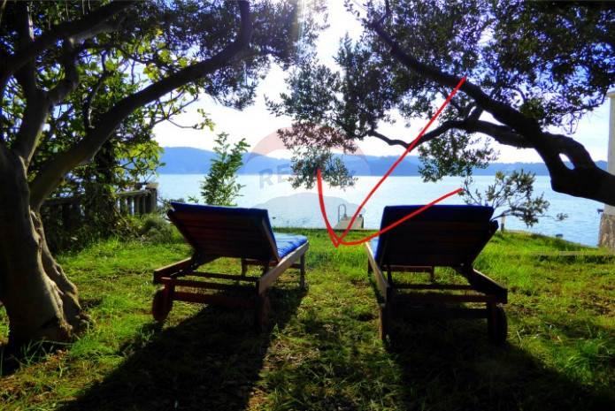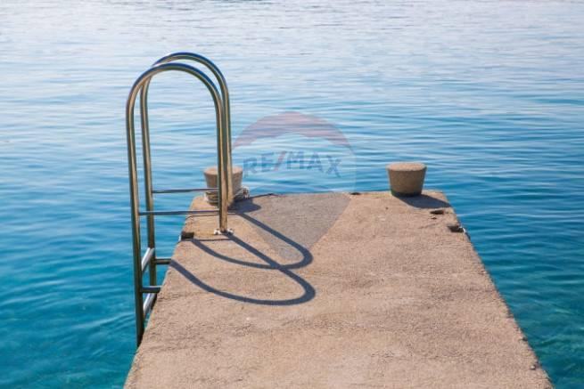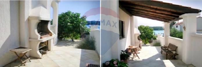 U prizemlju je jedan stan od 160,56 m2. Dvije spavaće sobe, dječja soba, kupaona, dva zasebna tuša sa sanitarijama, kuhinja i dnevna soba. Cijelom dužinom kuće u prizemlju se nalazi balkon koji stepenicama vodi u vrt. U vrtu sa jedne strane posađene su dvije masline, a s druge strane jos četiri masline koje su mlade. U ljetnim mjesecima tu su smještene ležaljke i ugođaj je predivan. Tu se jos nalazi i vinova loza koja krasi zid i lavanda koja svojim mirisom i ljepotom privlači poglede. Iz kuhinje se izlazi na terasu na kojoj se nalazi kamin (zajednički). U produžetku vrta nalazi se još jedna terasa sa sjedećim garniturama sa koje se pruža pogled, sa jedne strane na uvalu, a sa druge na otvoreno more i predivne otočiće u blizini.
