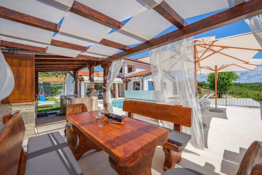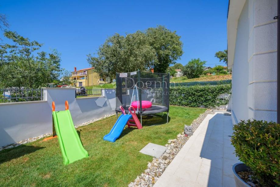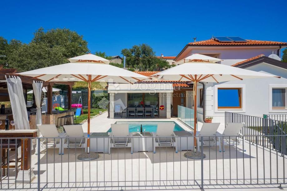 Prekrasno i decentno uređena i održavana okućnica pruža Vam sunčalište sa bazenom, dječje igralište, neizostavnu ljetnu kuhinju sa vanjskom garniturom i tri natkrivena parkirna mjesta.