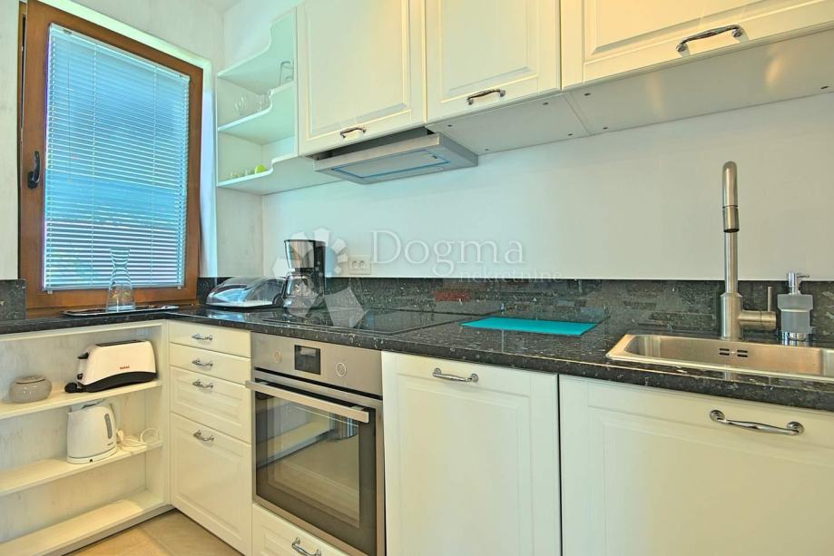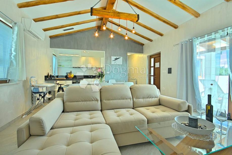 Sve veći trend u uređenju-open space kuhinje, blagovaone i dnevnog boravka krasi prizemlje te omogućuje prozračnost te neometani dotok sunčeve svijetlosti. Zatim u prizemlju možete pronaći i praonicu te dvije spavaće sobe, tri kupaonice-u jednoj se nalazi masažni bazen!
