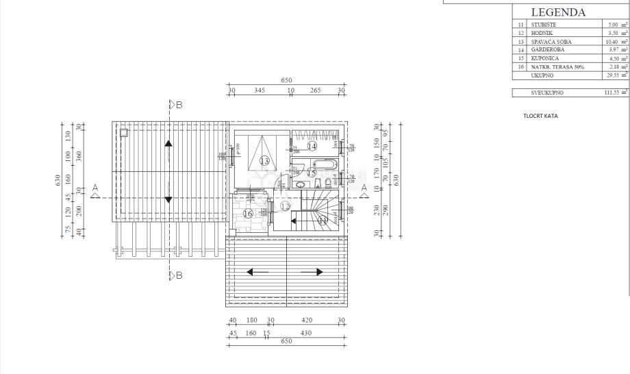 Na prvom katu nalazi se još jedna spavaća soba sa kupaonom, garderobom i izlazom na terasu.