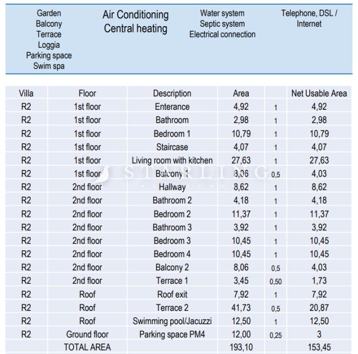 Vila se sastoji od 1. kata, 2. kata i krovne terase sa jacuzzijem.