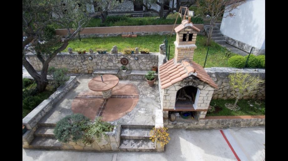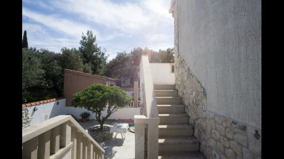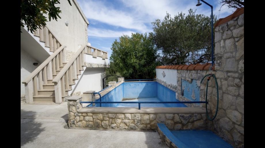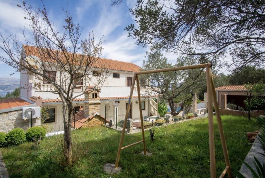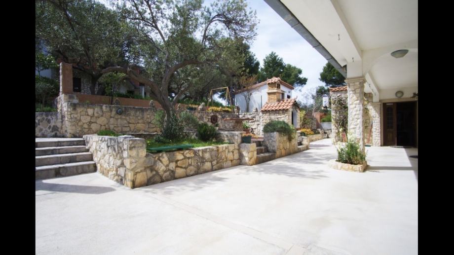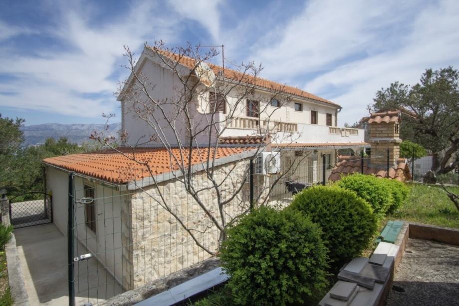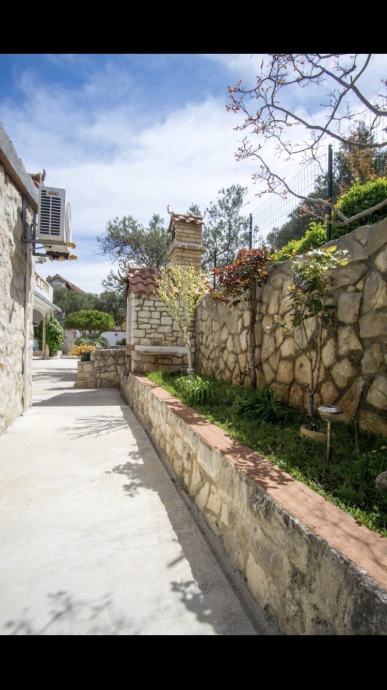 Prodaje se villa na placu površine 620m2. Villa se sastoji od prizemlja i kata. U prizemlju se nalazi dnevna soba sa blagovaonicom i kuhinjom, kupaonica, terasa, garaža i dva apartmana. Apartmani su dvosobni sa balkonom. Svaki površine 39m2. Na katu se nalazi dvosoban apartman sa balkonom površine 39m2 i apartman površine 39m2 koji je u završetku gradnje. U dvorištu ville nalazi se zaseban objekt u kojem je radna soba, terasa, bazen (10m2) , natkrivena terasa (15m2) i vrt sa maslinom starom 100 god. Ispred ville se nalaze četiri parkirna mjesta. Villa je građena i obložena bračkim kamenom, podovi mramor. Klimatizirano! Pogled more! Kategorizacija: tri zvjezdice. Villa je osigurana od štete.
