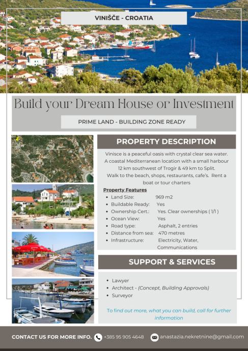 EKSKLUZIVNO prodajemo građevinsku parcelu mjestu Vinišće površine 969m2 otvorenog pogleda na more u građevinskoj M-1 zoni .