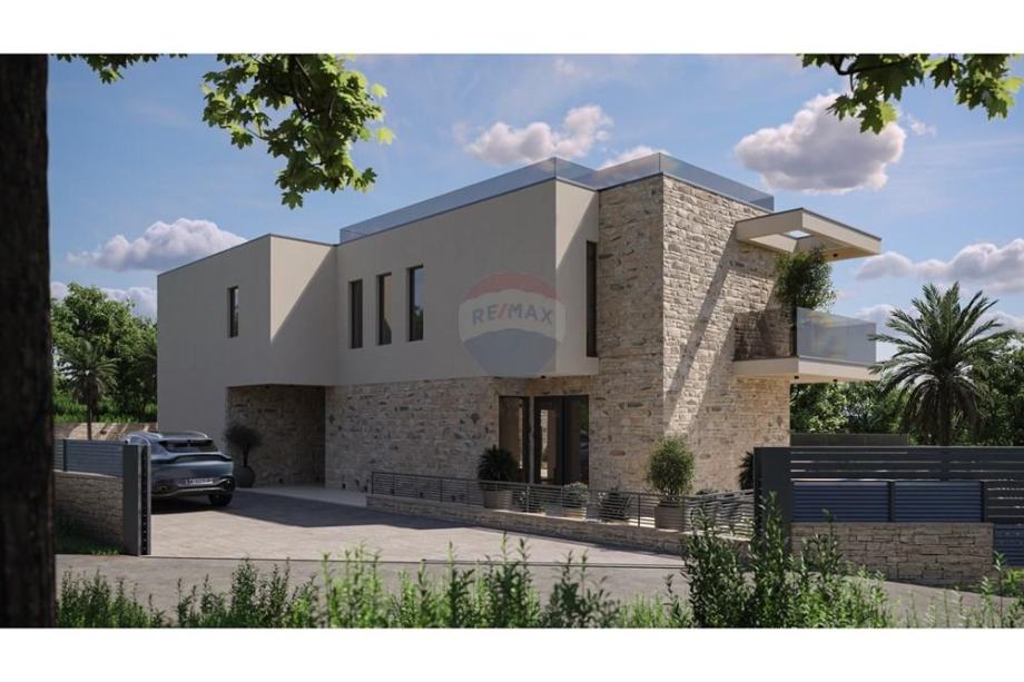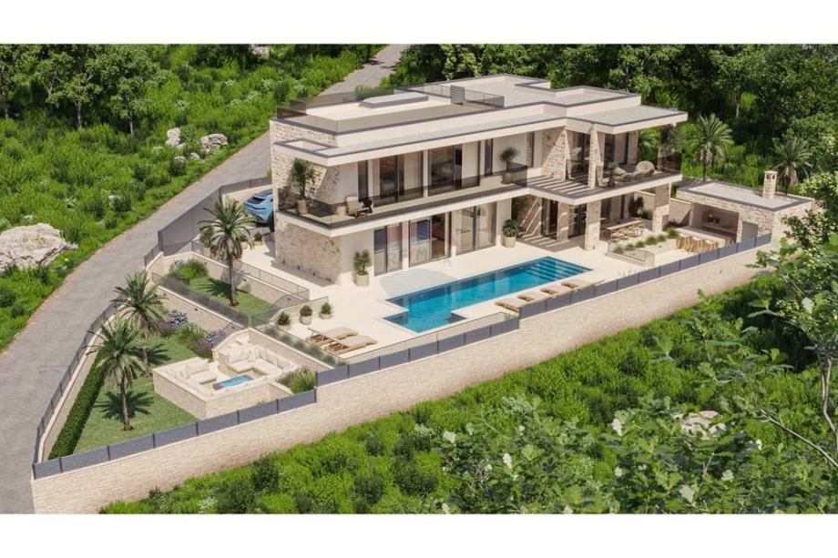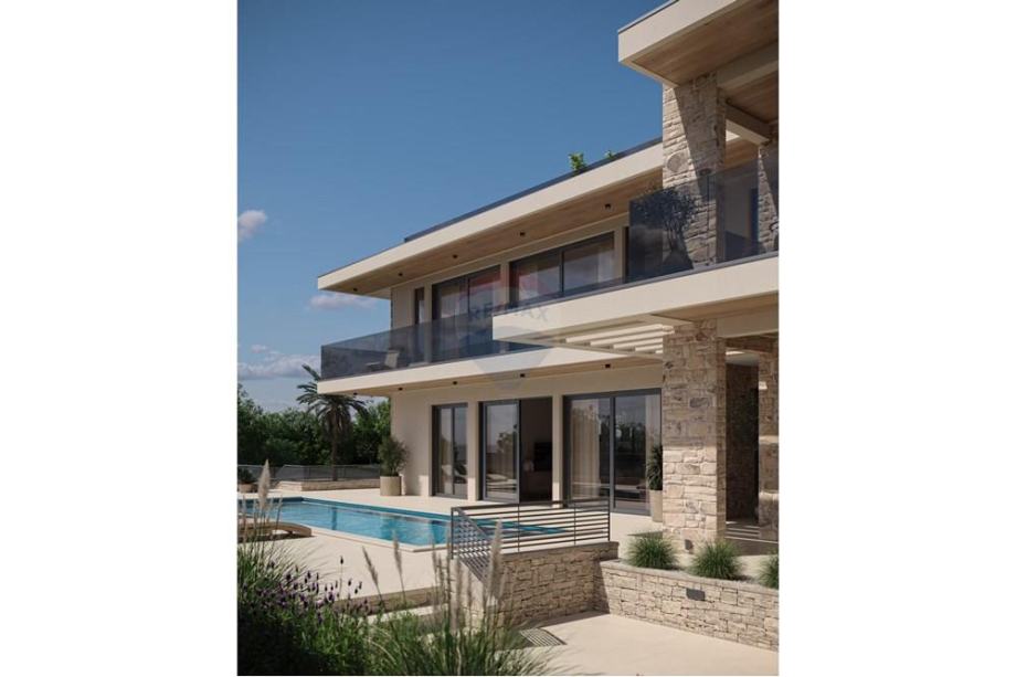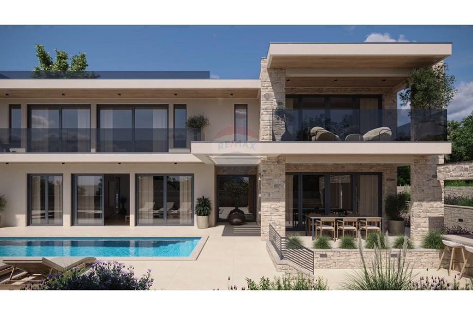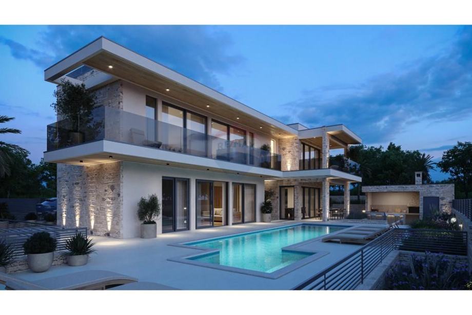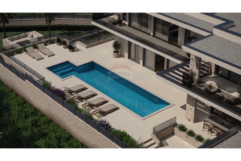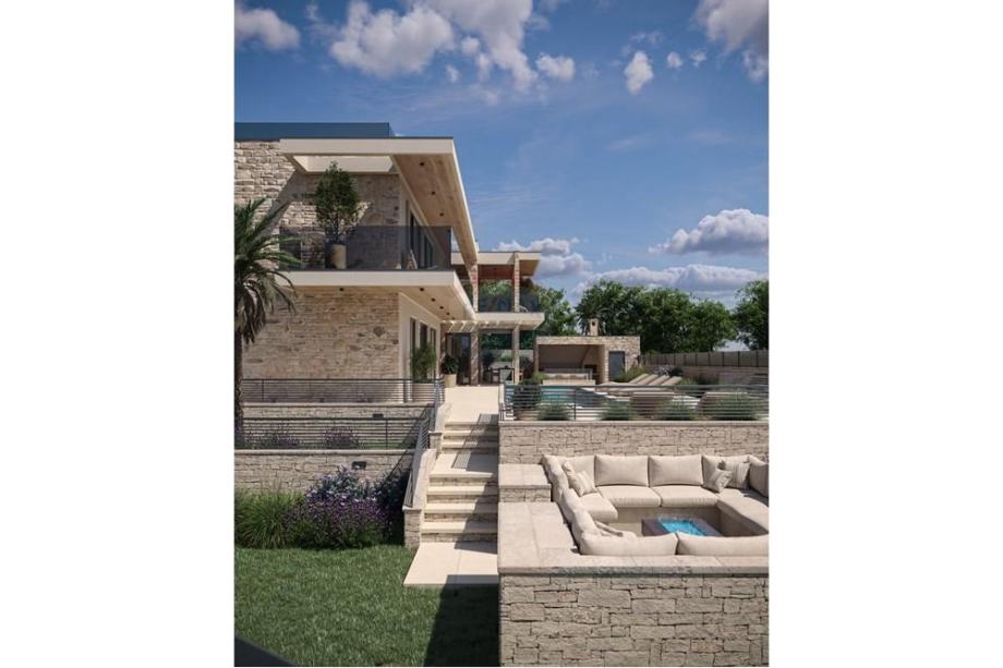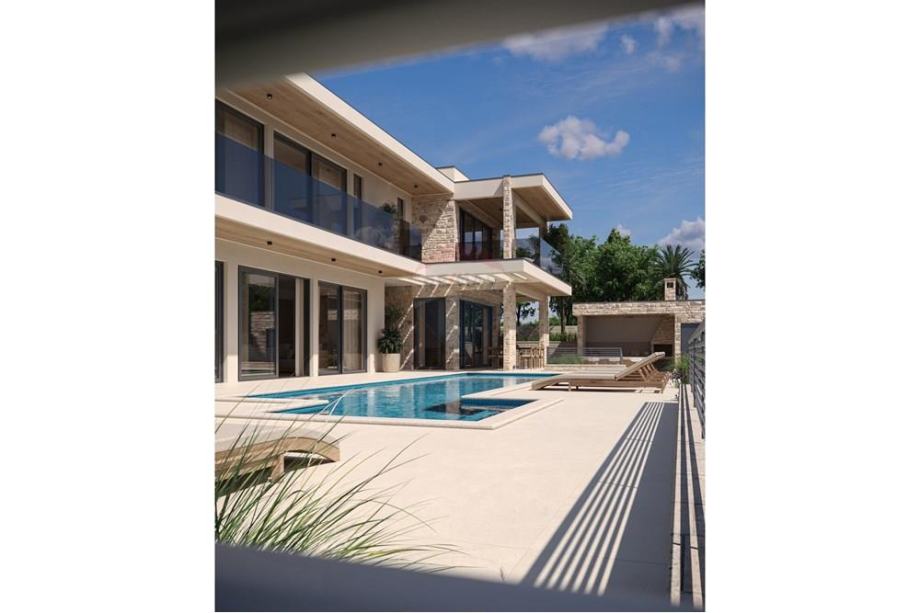 natkrivene prostore u obliku terasa, vrtova, sunčališta i natkrivenu ljetnu kuhinju, te bazen.