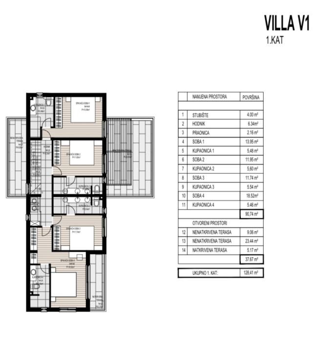 I. KAT: četiri spavaće sobe sa vlastitom kupaonicom, praonica, hodnik
