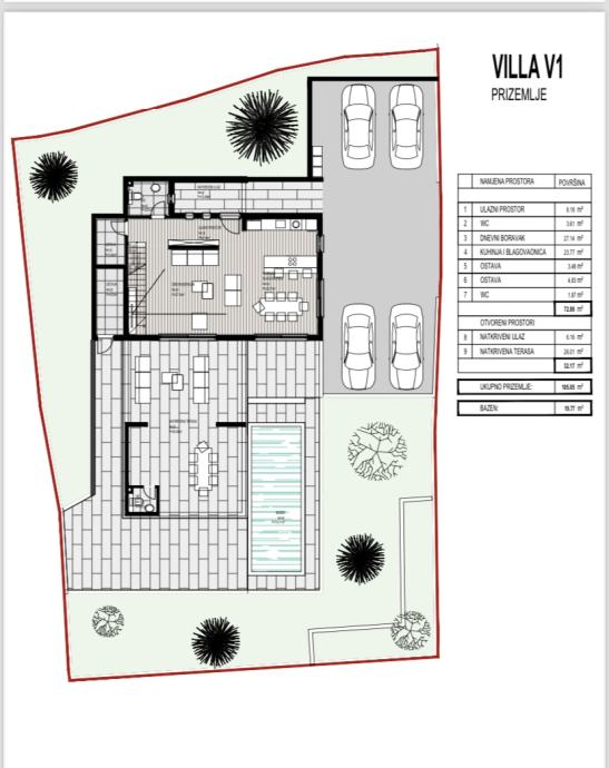PRIZEMLJE: ulazni prostor/predsoblje, dvije kupaonice, ostava, kuhinja i blagovaonica, dnevni boravak, terasa i bazen
