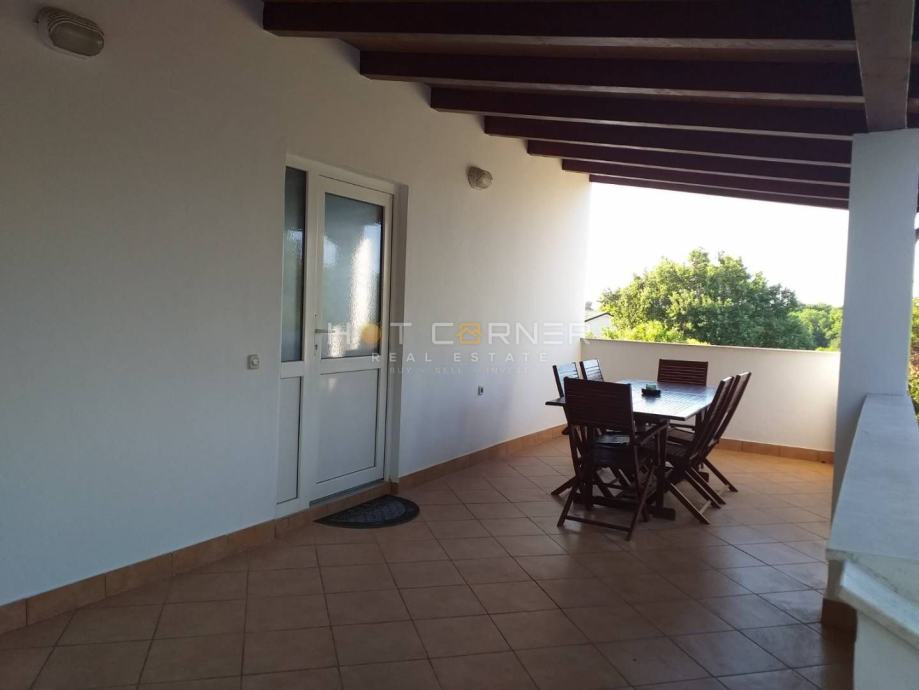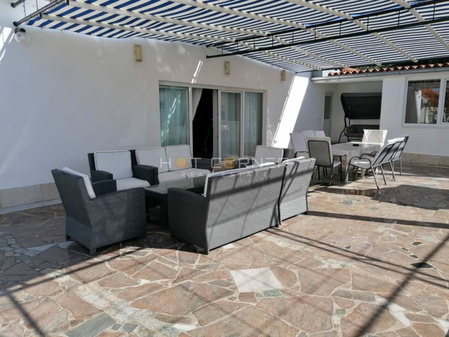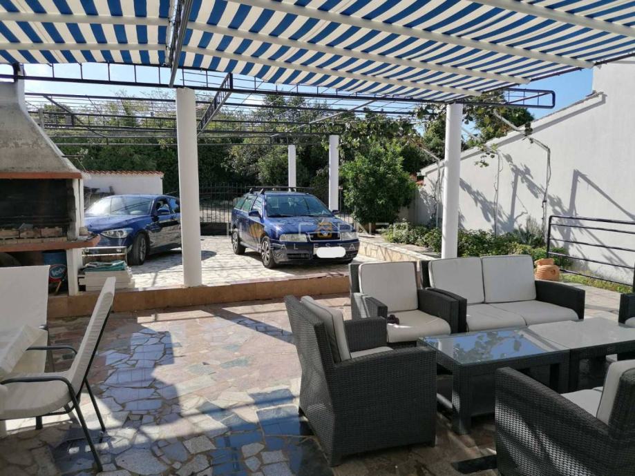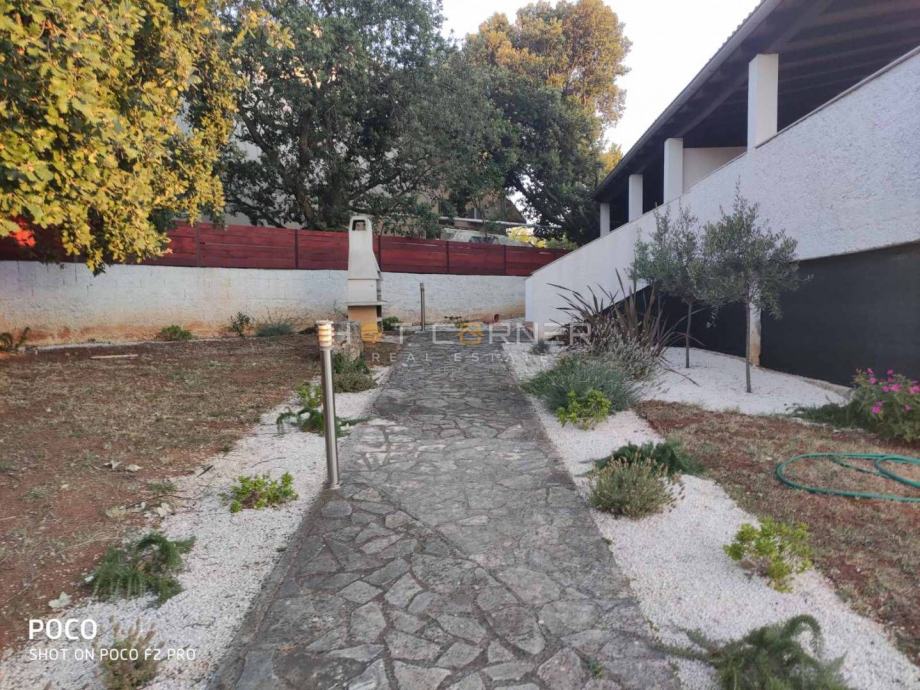 Ispred kuće se nalazi veće dvorište sa 4 parkirna mjesta za automobile, roštilj i velika natkrivena terasa. Iz prednjeg dvorišta se pristupa i konobi površine 50m2, te garaži površine 50m2 namjenjenoj za 4 automobila koja posjeduje i vlastitu kupaonicu.
