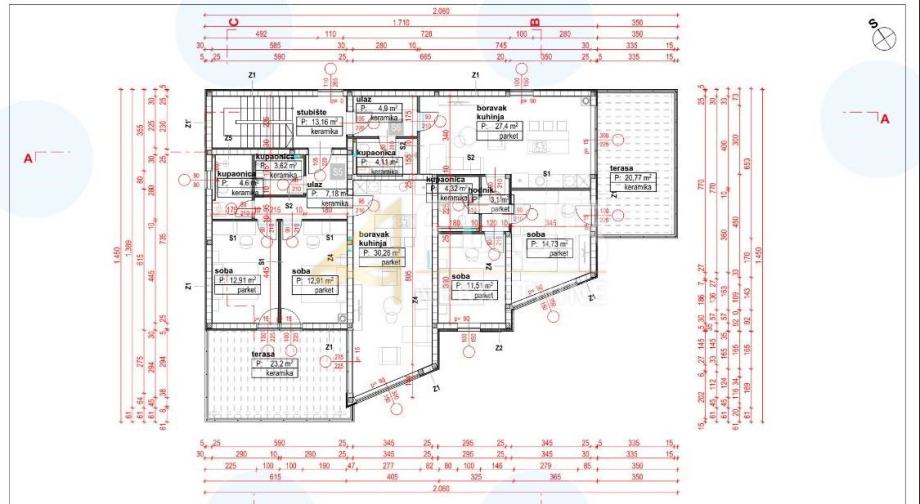 Stan, površine 71.48m2 sastoji se od kuhinje s blagovaonicom i dnevnog boravka u otvorenom prostoru s izlazom, dvije spavaće sobe, hodnika, dvije kupaonice i terase.