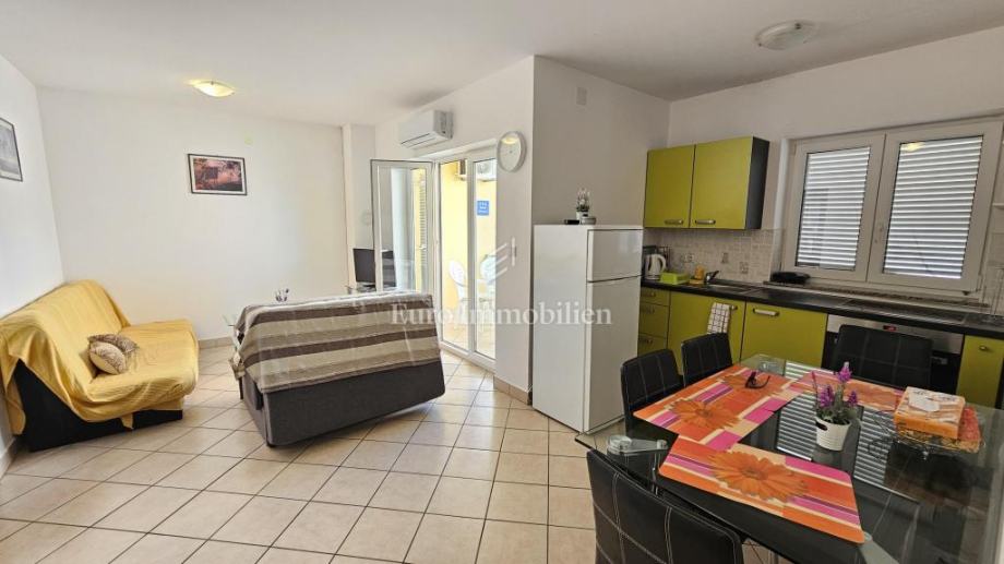 Na prodaju je apartman površine 70 m od plaže, smješten u manjem objektu s ukupno 4 apartmana, na mirnoj lokaciji zapadne orijentacije. Apartman se sastoji od spavaće sobe, kupaonice, kuhinje s dnevnim boravkom te loggie. Potpuno je namješten i opremljen, te se prodaje u viđenom stanju.