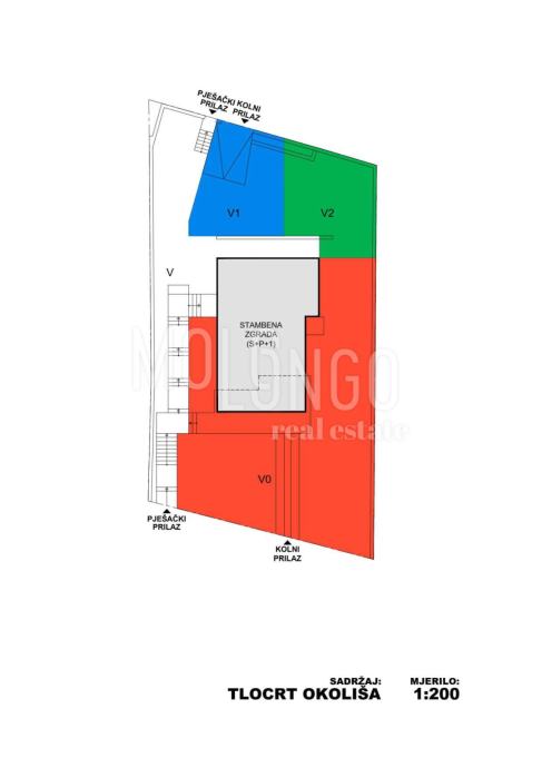 Iznad apartmana je pripadajući prostor (tavan 22.42m2). Apartmanu također pripada dio vrta/okućnice površine 72.11m2 (označeno zelenom bojom na slici).