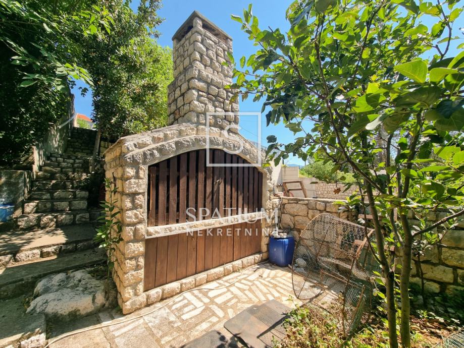 Prostrana okućnica s parkiralištem, vrtom i roštiljem okružena je bogatom vegetacijom mediteranskog bilja i drveća.