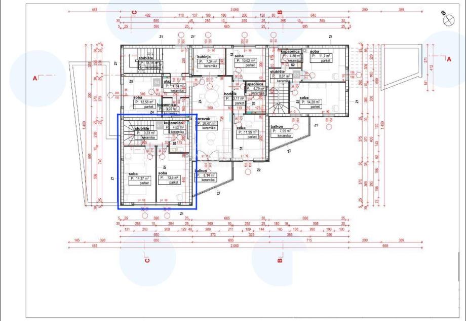 Stan iz današnje ponude nosi oznaku S1, dvoetažan je njegova ukupna površina iznosi 268,95 m2 (s pripadajućim koeficijentima 146,13 m2).