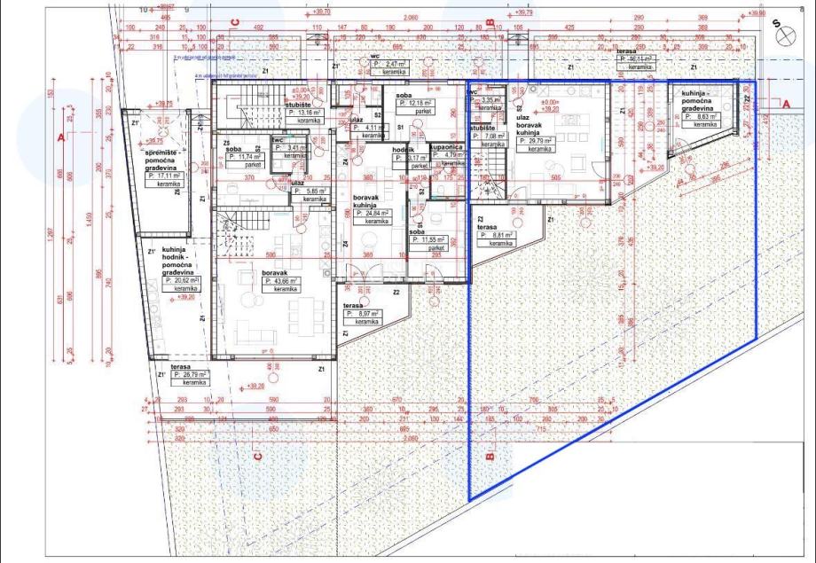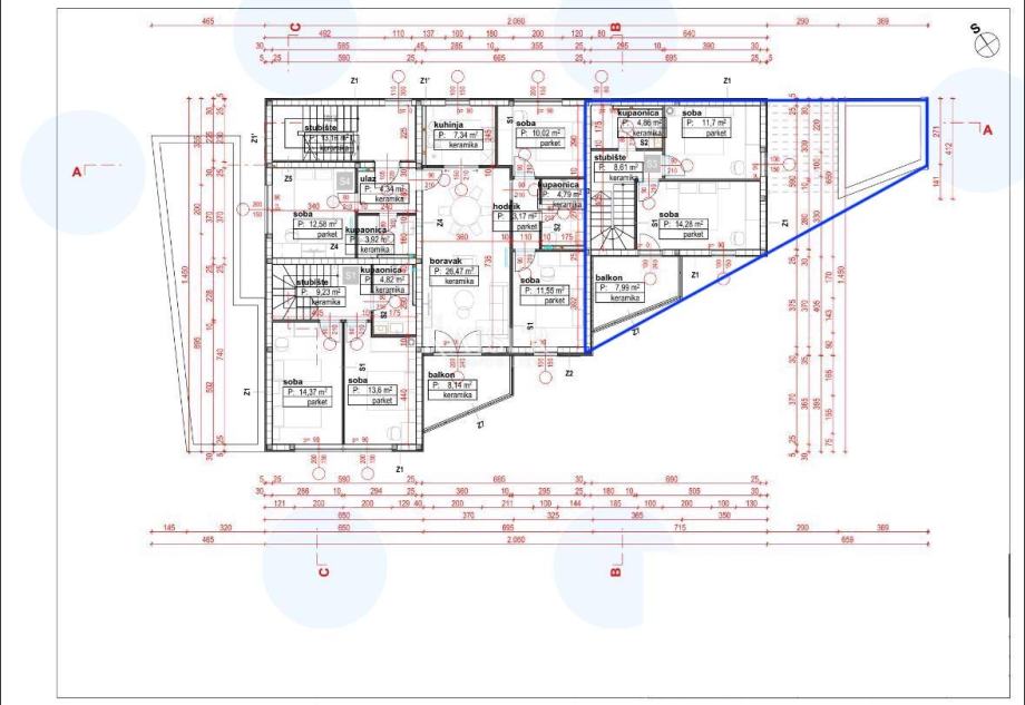 Stan iz današnje ponude nosi oznaku S3, dvoetažan je njegova ukupna površina iznosi 304,96 m2 (s pripadajućim koeficijentima 107,92 m2).