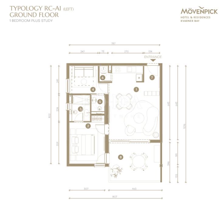 Smješten u drugom redu do mora, ovaj jednosobni apartman u prizemlju sastoji se od dnevnog boravka s kuhinjom i blagovaonicom, glavne spavaće sobe s vlastitom kupaonicom, dodatne prostorije koja može poslužiti kao radna soba ili manja spavaća soba, WC-a, utility prostora te prostrane terase od 14,76 m².