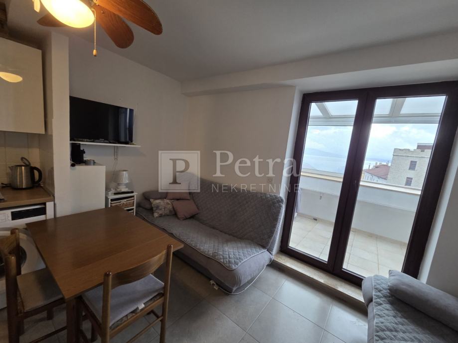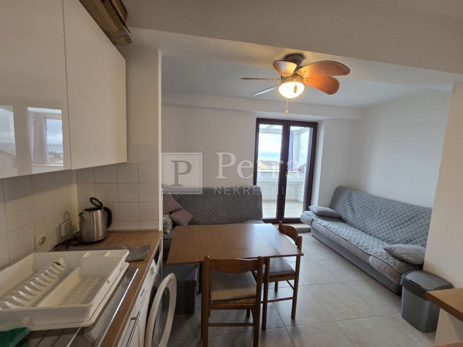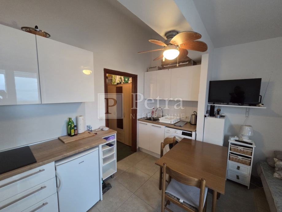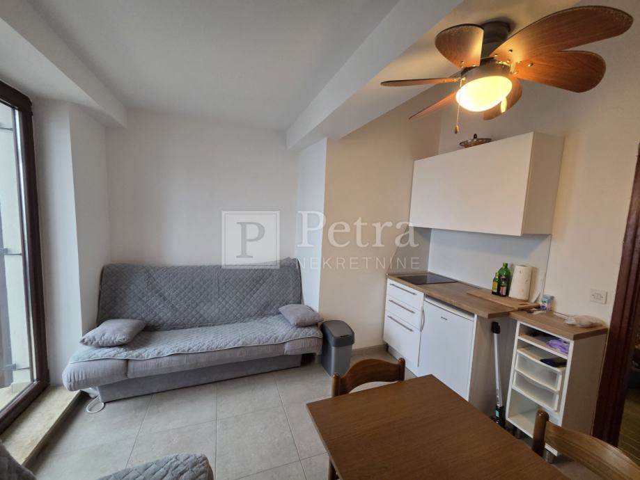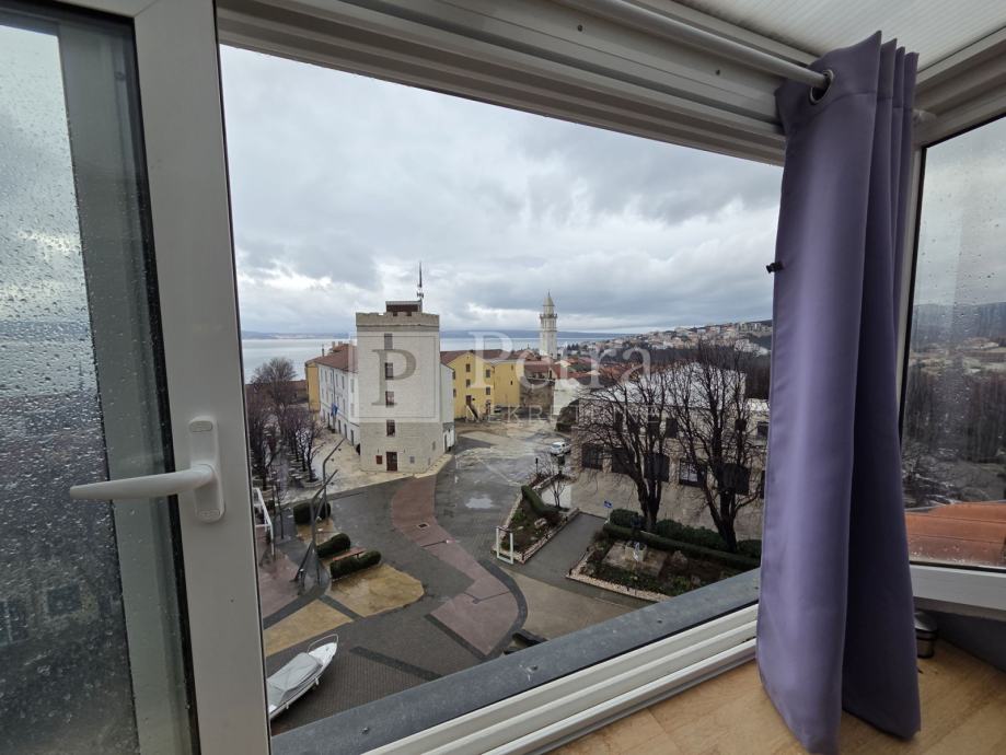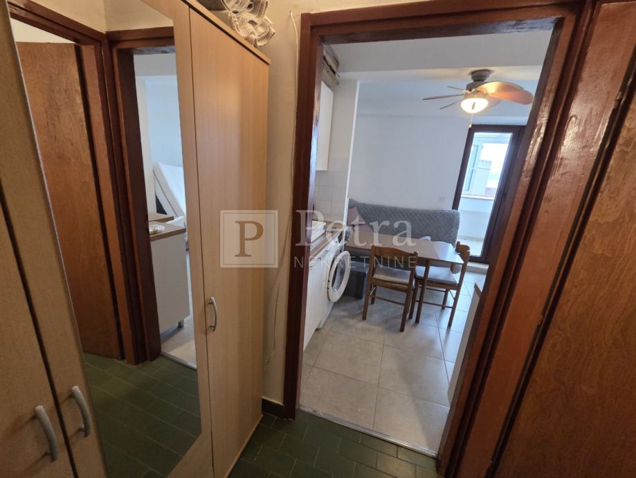 Jednosobni stan na četvrtom katu koji se sastoji od sobe, kupaone, predsoblja i loggie ukupe površine 19,40 m2. Nalazi se u centru grada. Prodaje se namješten. Adaptiran 2022. godine. Iz loggie se pruža pogled na trg i more. Stanu pripada drvarnica.