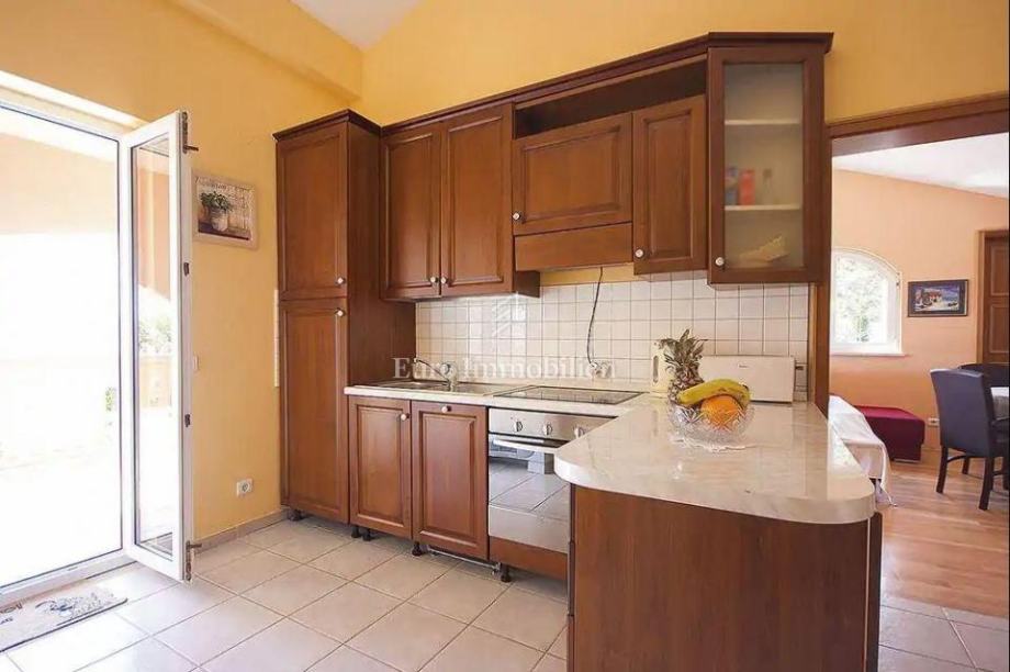 Uređena i u potpunosti ograđena okućnica pruža visoku razinu privatnosti, a obuhvaća ljetnu kuhinju, sjenicu i prostor za roštilj. U dvorištu se nalazi i bazen sa sunčalištem te zelena živica koja dodatno upotpunjuje ambijent.