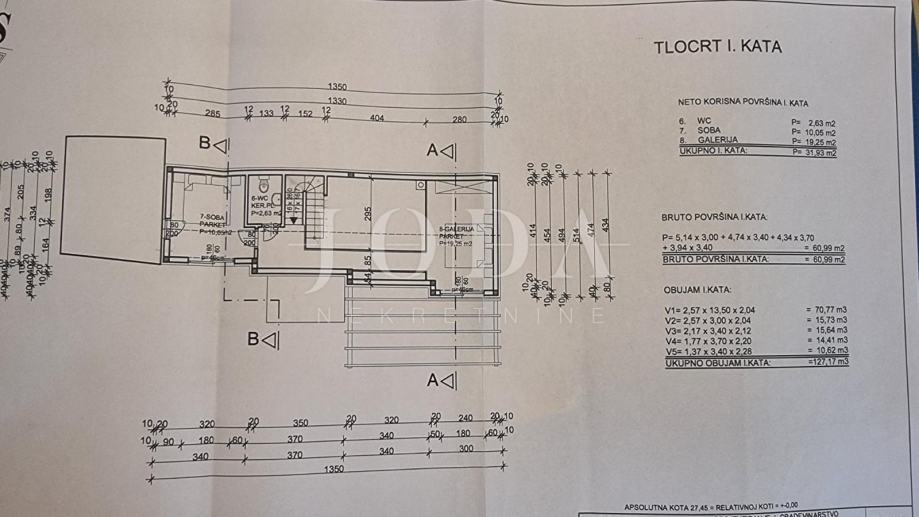 U prizemlju su dvije spavaće sobe,kupaonica te huhinja i dnevni dio dok je na katu spavaća soba sa kupaonicom te veliki galerijski prostor.