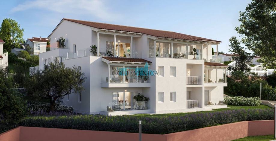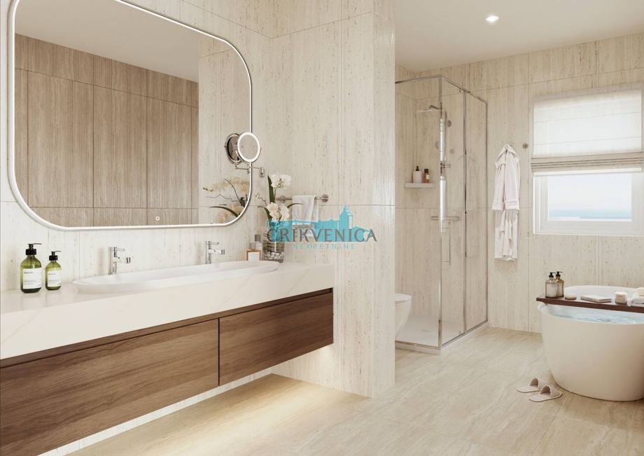 U ponudi je luksuzni apartman, smješten na 1.katu zgrade, 1.red do mora. Sastoji se od dnevnog boravka s kuhinjom i blagovaonicom, 2 spavaće sobe, 2 kupaonice, ulaznog prostora i te 2 terase.