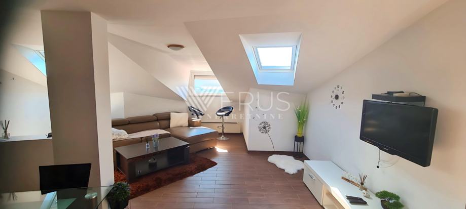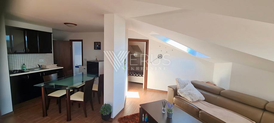 Stan se sastoji od dvije spavaće sobe, kupaonice te prostranog dnevnog boravka povezanog s kuhinjom i blagovaonicom, što prostoru daje dodatnu otvorenost i funkcionalnost. Tlocrtna površina stana iznosi 70 m², dok je zbog kosina u vlasničkim dokumentima upisano 50 m².