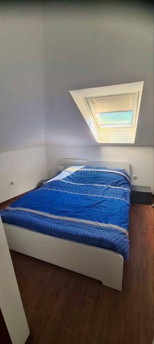 Zahvaljujući kosinama i velikim otvorima, stan je izuzetno osvijetljen i ugodan za boravak, a iz dnevnog prostora pruža se prekrasan pogled na more i grad. Opremljen je klima-uređajem te se prodaje kompletno namješten, bez potrebe za dodatnim ulaganjima.