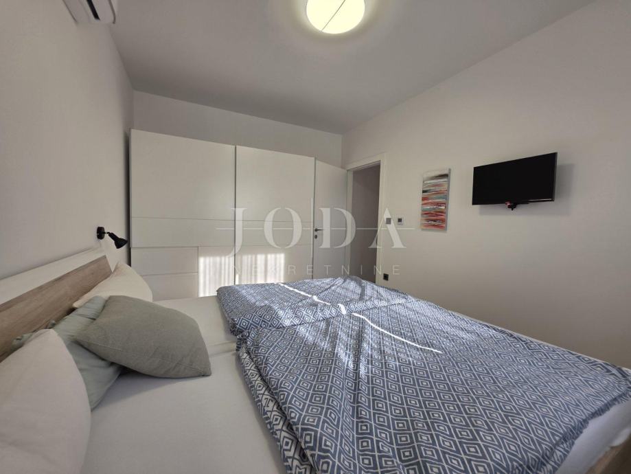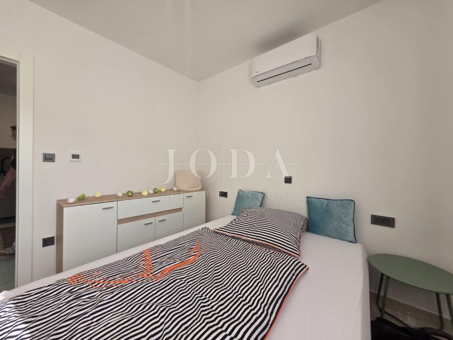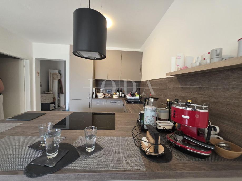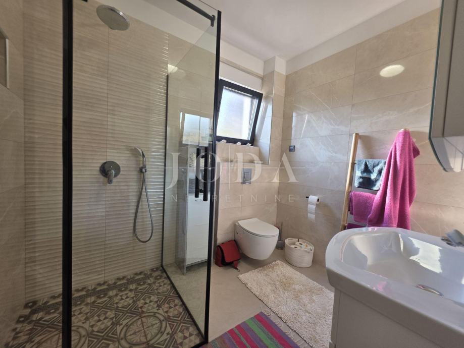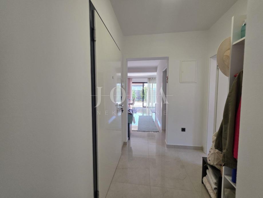 na prostranu terasu (od koje je 15,35 m² natkriveno, a 50 m² nenatkriveno) idealnu za druženja i opuštanje, dvije spavaće sobe, moderno uređene kupaonice i hodnika koji povezuje sve prostorije u skladnu cjelinu. Stan se prodaje potpuno namješten, klimatiziran i opremljen podnim grijanjem, što osigurava ugodnu temperaturu tijekom cijele godine. Unutar privatne okućnice nalaze se parkirna mjesta za više vozila, što je dodatna pogodnost za vlasnike i goste. Ovo je idealan izbor za one koji traže miran obiteljski dom, vikend oazu ili odmor u ljetnim mjesecima.