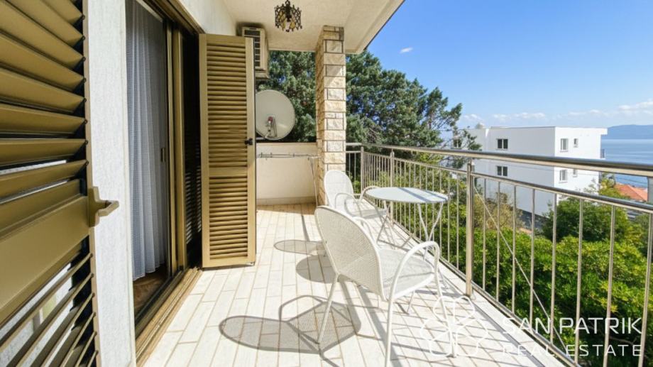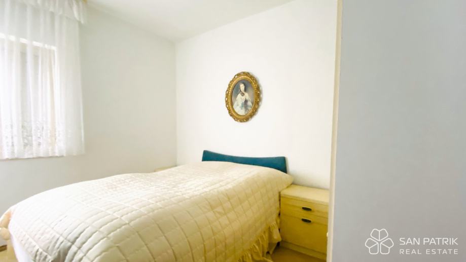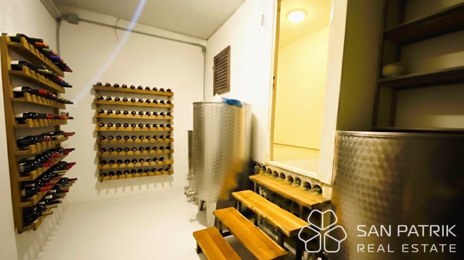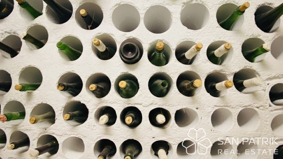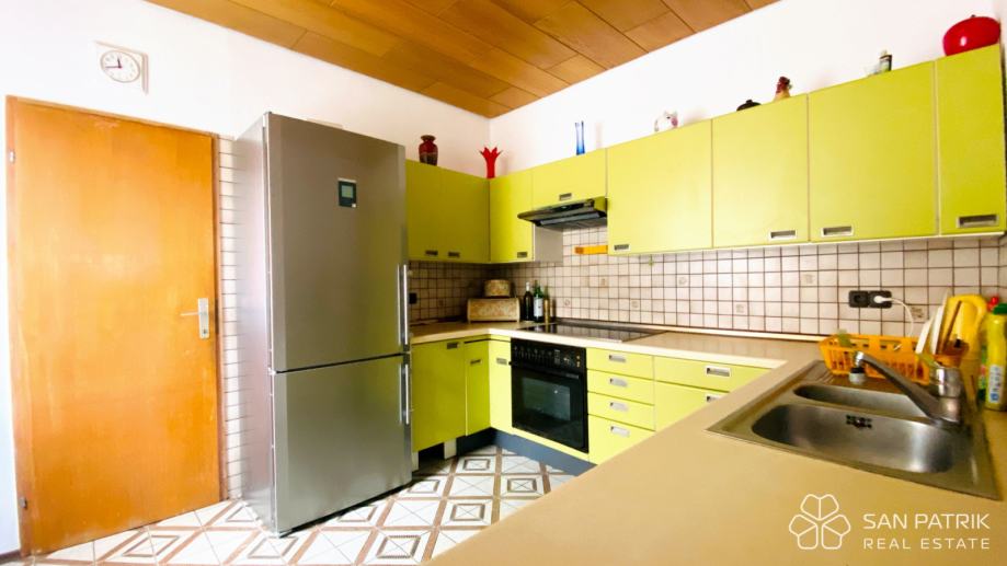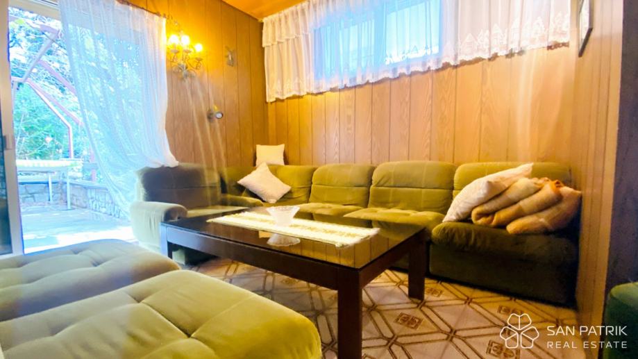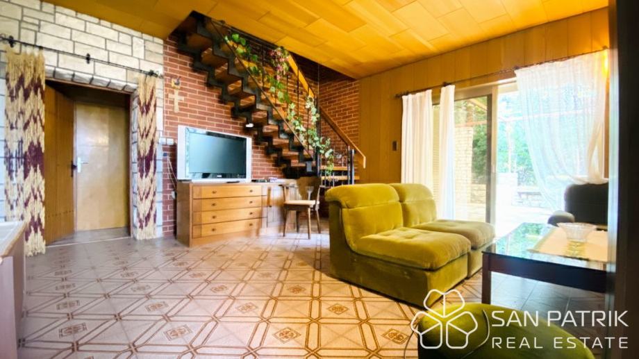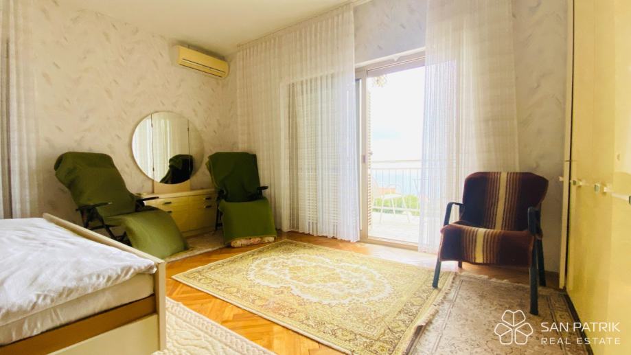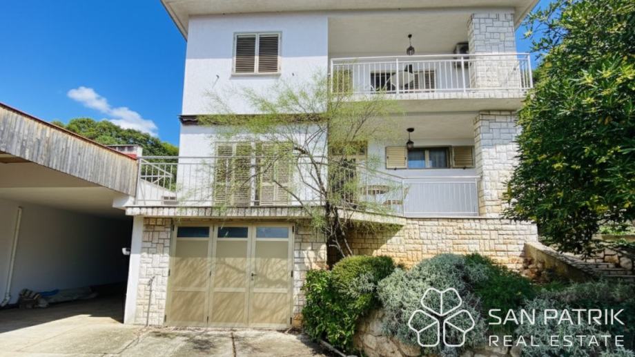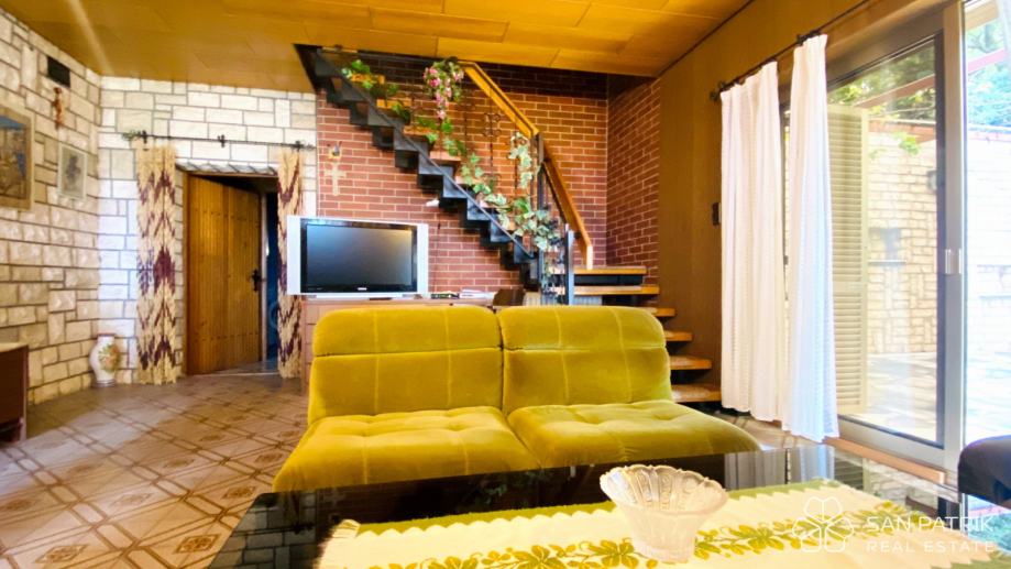 Ukupna površina parcele iznosi približno 700 m², dok se stambeni prostor kuće od oko 170 m² prostire na dvije etaže povezane unutarnjim stubištem, s dodatnim podrumom i dvjema garažama. U prizemlju se nalazi prostrani dnevni boravak s izlazom na popločano dvorište i natkrivenu terasu s kaminom i roštiljem, kuhinja s blagovaonicom, kupaonica te pomoćne prostorije i spremište. Kat kuće obuhvaća tri udobne spavaće sobe, kupaonicu i prostranu natkrivenu terasu s pogledom na more – savršeno mjesto za jutarnju kavu ili opuštanje uz zalazak sunca. U podrumskom dijelu smještena je druga garaža s dodatnim natkrivenim prostorom koji omogućuje parkiranje brodice, glisera ili više automobila.