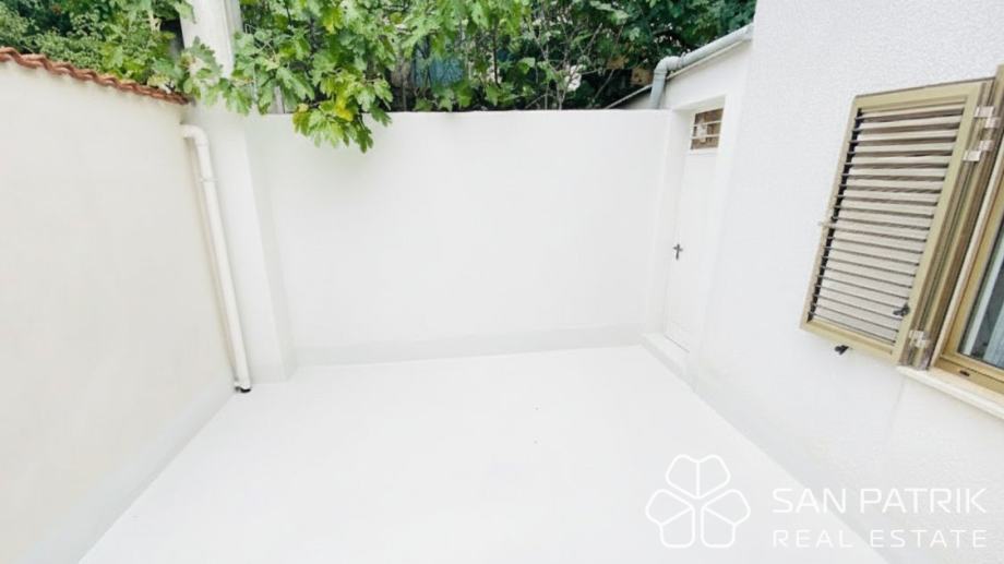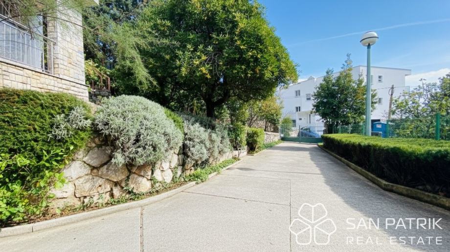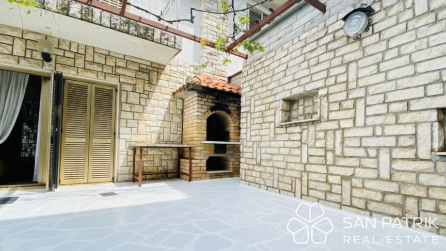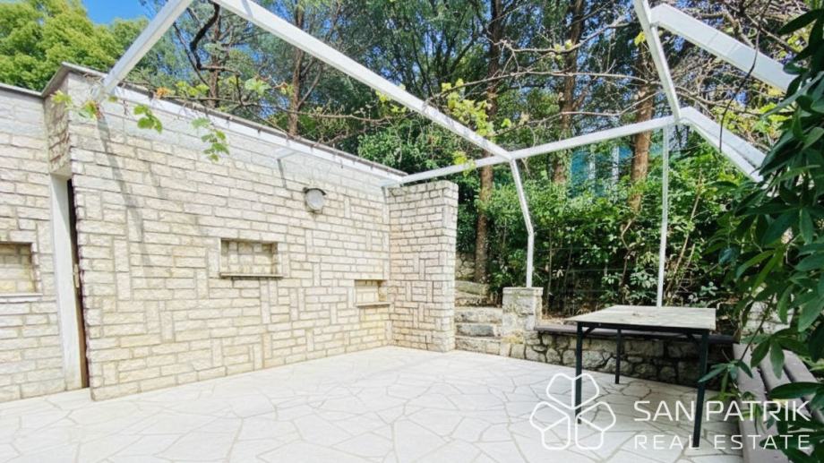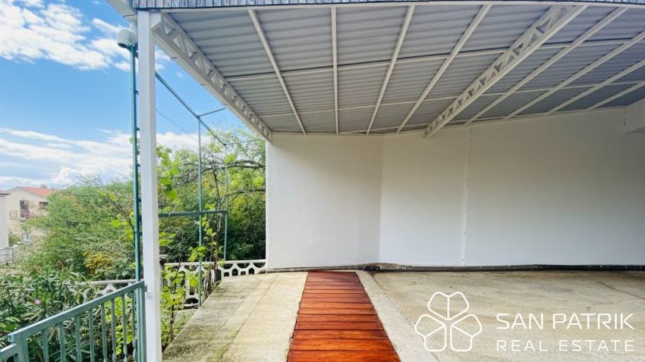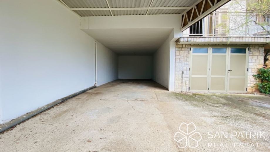 Uređena okućnica s više terasa i zelenih površina omogućuje kombinaciju parkiranja, prostora za roštilj te dijela vrta ili sunčališta. U okviru parcele nalazi se dovoljno prostora za boravak na otvorenom, dok natkriveni prilaz i uređeni pristupi omogućuju jednostavno manevriranje većim vozilima i brodicom. Kuća se nalazi na izvrsnoj lokaciji – nekoliko minuta hoda od mora i plaža, dok su svi osnovni sadržaji dostupni u blizini. Okruženje je mirno i privatno, idealno za obiteljski odmor ili cjelogodišnje stanovanje.