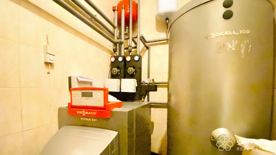 Kuća je građena klasičnom, masivnom gradnjom (opeka i armirani beton), s kamenim detaljima i stabilnom konstrukcijom. Opremljena je centralnim grijanjem na lož ulje (Viessmann) s radijatorima i podnim grijanjem u kupaonici, a dodatno je postavljen klima uređaj za hlađenje tijekom ljetnih mjeseci.