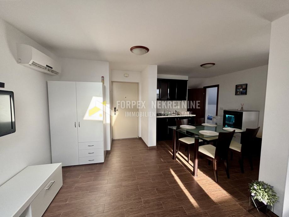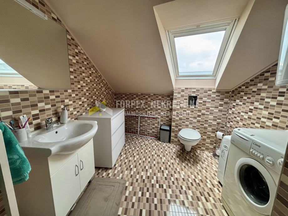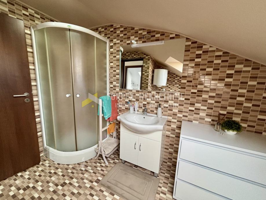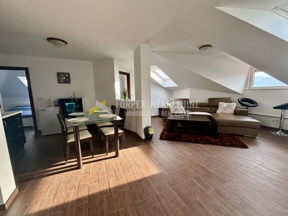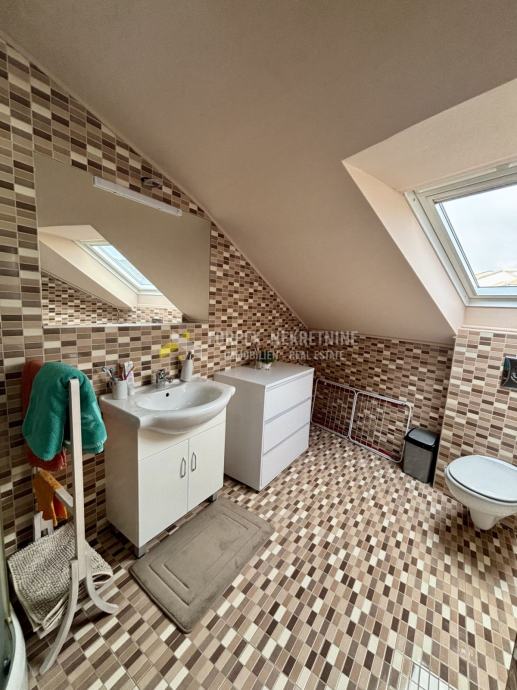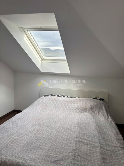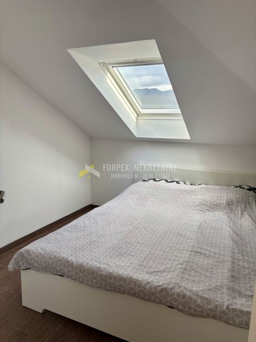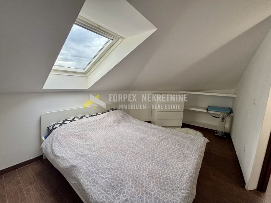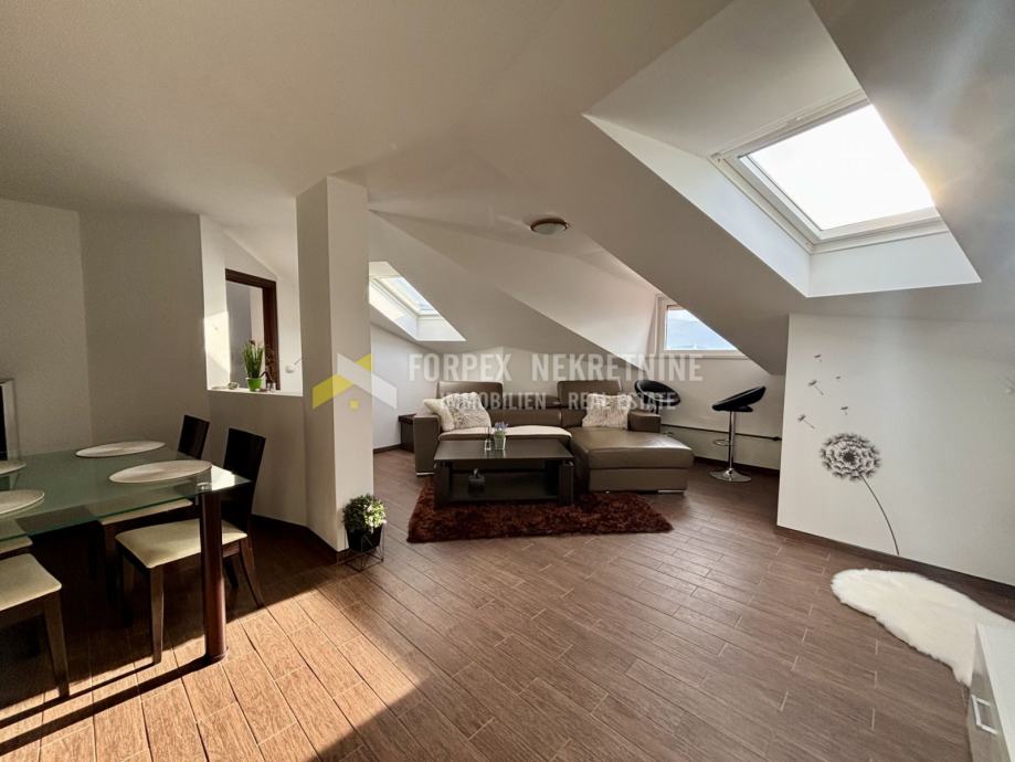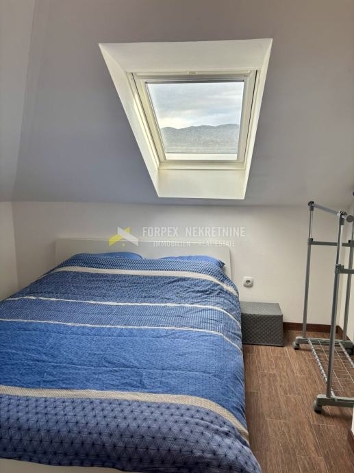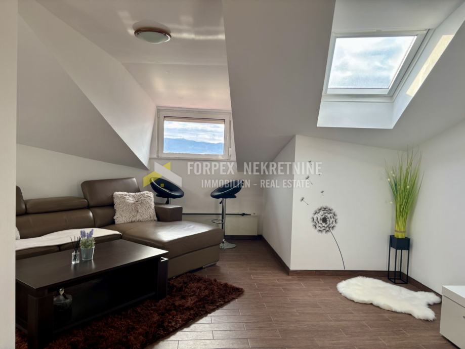 Stan se sastoji od dvije spavaće sobe, kupaonice, a kuhinja, blagovaonica i dnevni boravak čine jednu cjelinu. Stan je ugodan i prostran, vrlo svjetal. Održavan, namješten i kao takav se prodaje. Stan ima upisanih 50m2, ali u naravi ima 70m2. Zbog kosina i nedovoljnih visina upisani je samo 50m2.