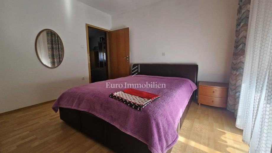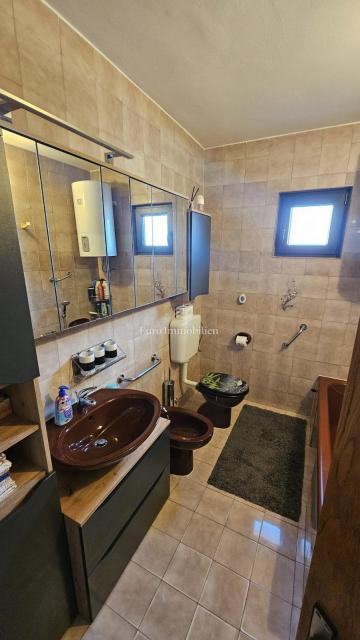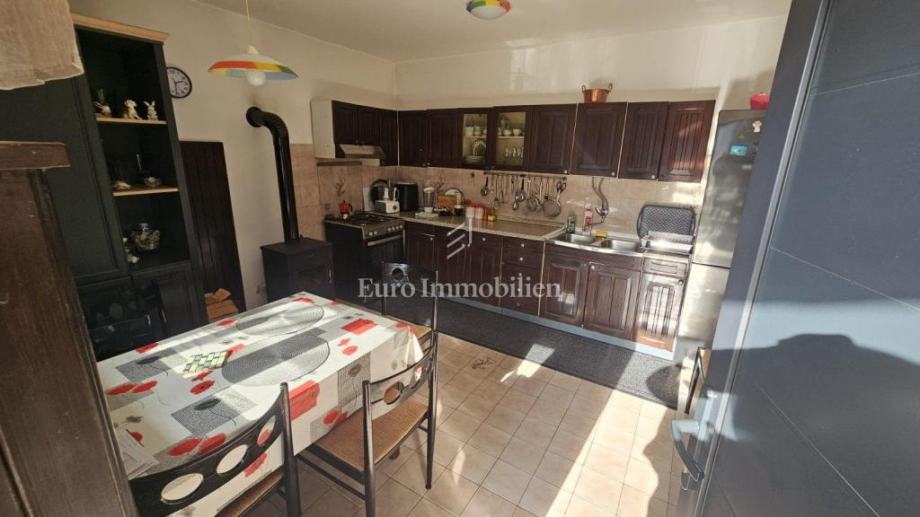 Na prvoj etaži kuće od 106m2 nalazi se stan sa tri spavaće sobe, kuhinja sa blagovaonicom, dnevni boravak, ostava, kupaona,hodnik i balkon koji se proteže cijelom dužinom etaže.