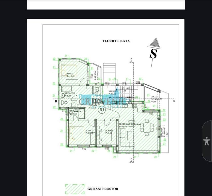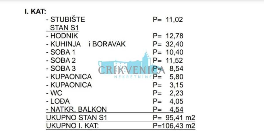 Nekretnina je prostrana, tri spavaće sobe, jedna ima svoju terasu, prostrani dnevni boravak sa kuhinjom i blagovaonom sa dva izlaza na terasu i loggiu, kupaonu sa wc-om i wc-om za goste.