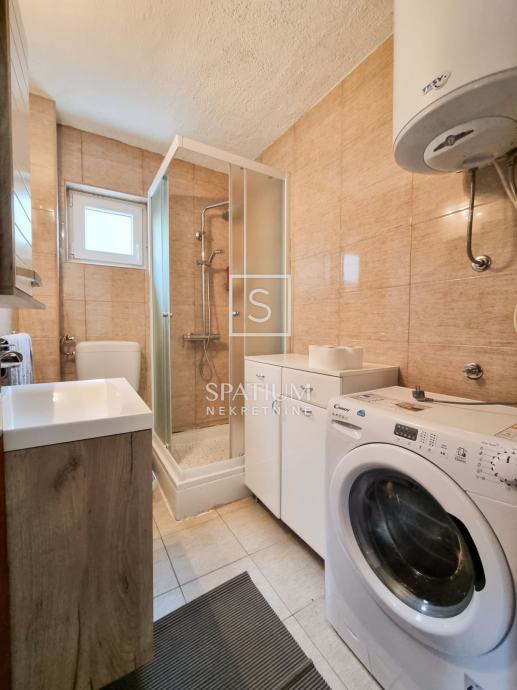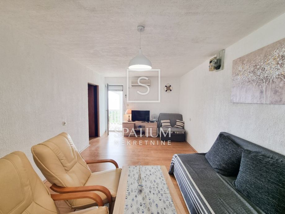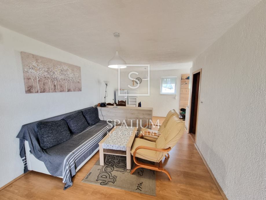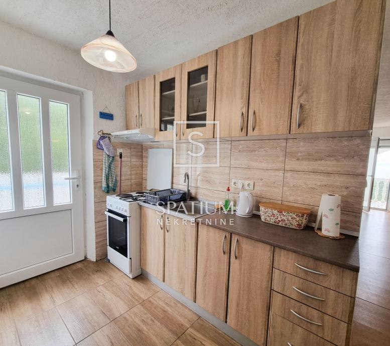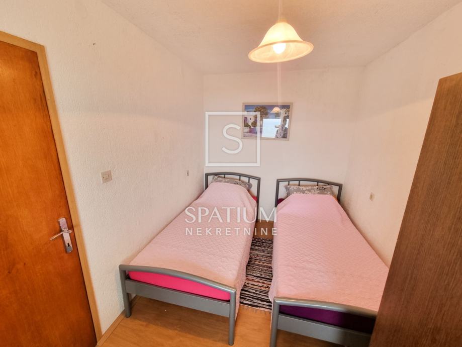 Površine je 46 m2 i sastoji se od ulaznog hodnika, spavaće sobe, kuhinje s blagovaonicom i dnevnog boravka s izlazom na veliku terasu (20m2) s prekrasnim panoramskim pogledom na more. Stanu pripada i parkirno mjesto, dio okućnice, te dodatna grill terasa.