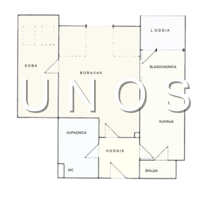 Stan se sastoji od spavaće sobe, dnevnog boravka, kuhinje s blagovaonicom koja izlazi na lođu, špajze, kupaonice s wc-om i hodnika.
