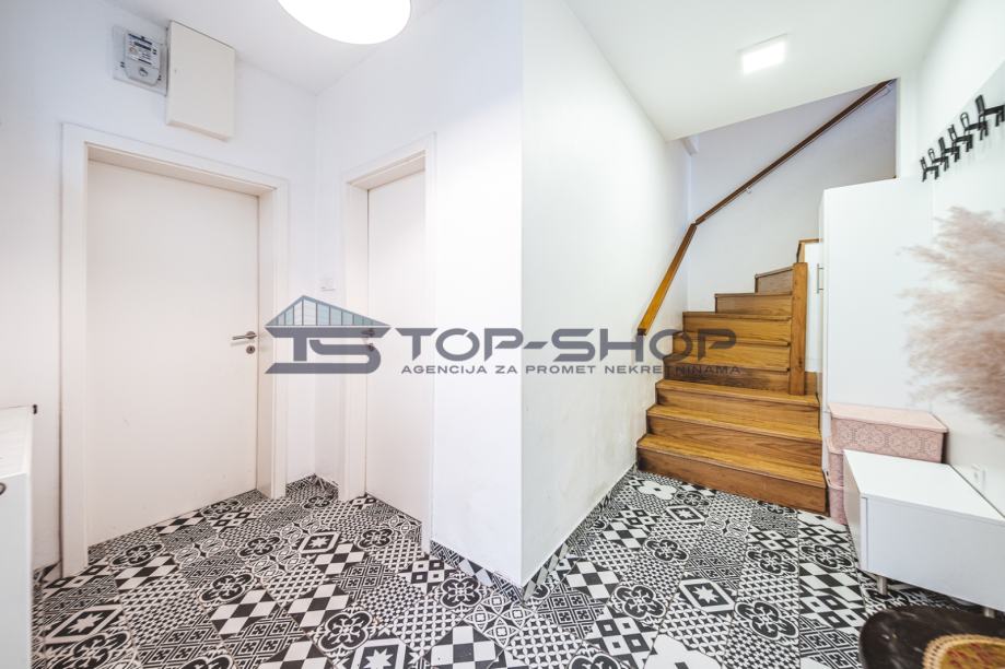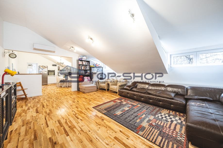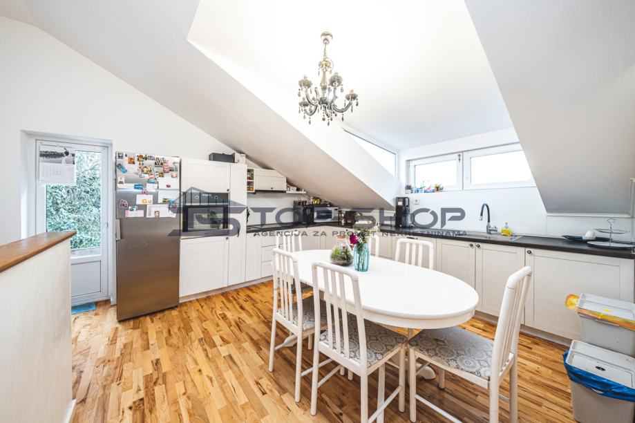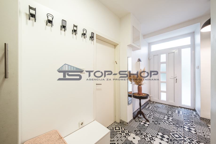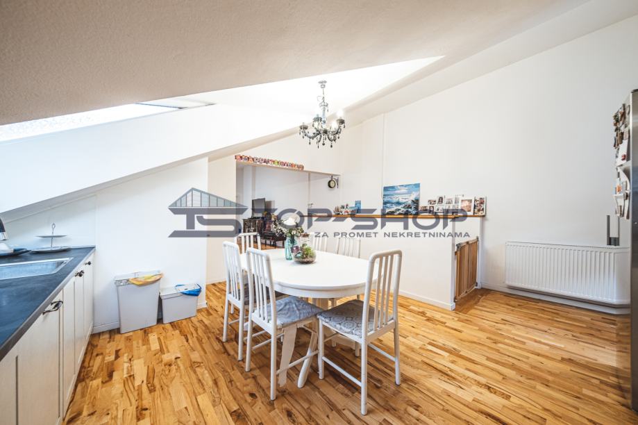 Kroz glavni ulaz vaši gosti ulaze u hodnik u kojem mogu ostaviti kapute i cipele te se hrastovim stubištem penju na gornju etažu, bez potrebe prolaska kroz ostale sobe. Dočekuje ih prostrani otvoreni prostor koji se prilagođava svim vašim potrebama - zajedničko kuhanje u novoj kuhinji izrađenoj po mjeri, svečani objed za obiteljskim stolom, opuštanje uz dobru knjigu, filmska večer uz izležavanje na garnituri koja može primiti cijelo društvo ili pak pravi mali plesnjak uz pravu glazbu i bez brige smetate li susjede ispod vas. I kao poseban užitak, kava uz sunce i cvrkut ptica na terasi koja kao da nije u istome gradu.