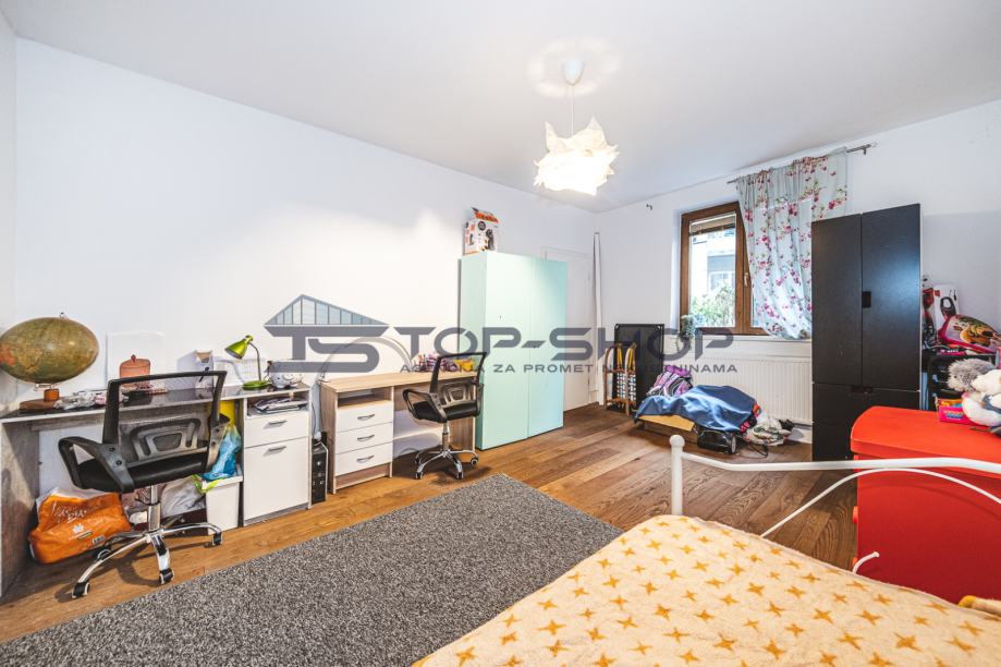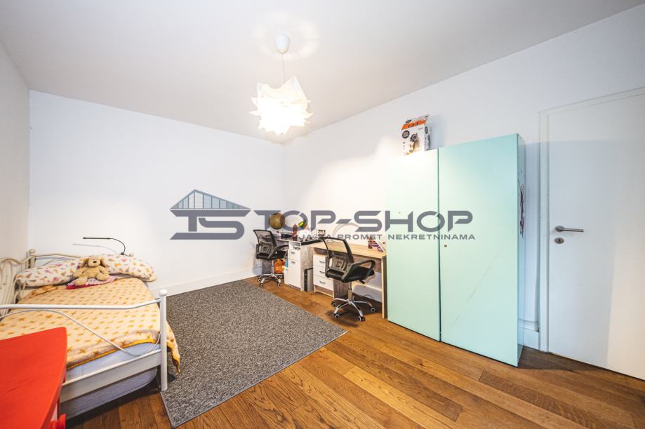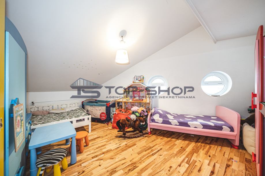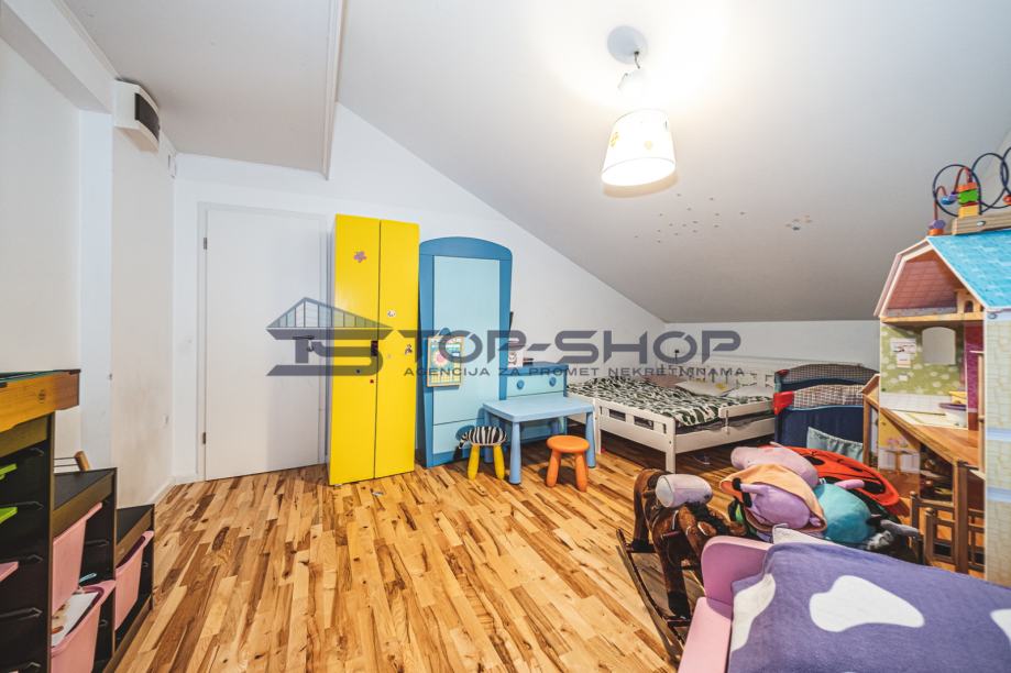Budući ćete većinu vremena provoditi na gornjoj etaži, na njoj se nalaze još i gostinjski WC te dječja soba kako bi vam mališani bili uvijek na oku. U dječjoj sobi nalazi se i ugradbena ostava (galerija) velike zapremine koja će s lakoćom progutati svu zimsku robu, rezervnu posteljinu, opremu za more i sve ostalo što ne želite gledati izvan sezone.